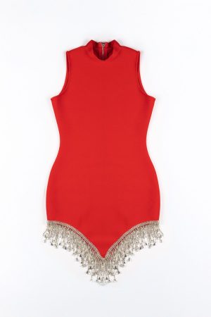 Rhinestone-Fringe Mock Neck Mini Dress