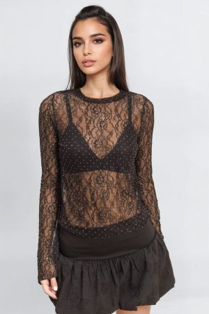 Studded Sheer Lace Long-Sleeve Top