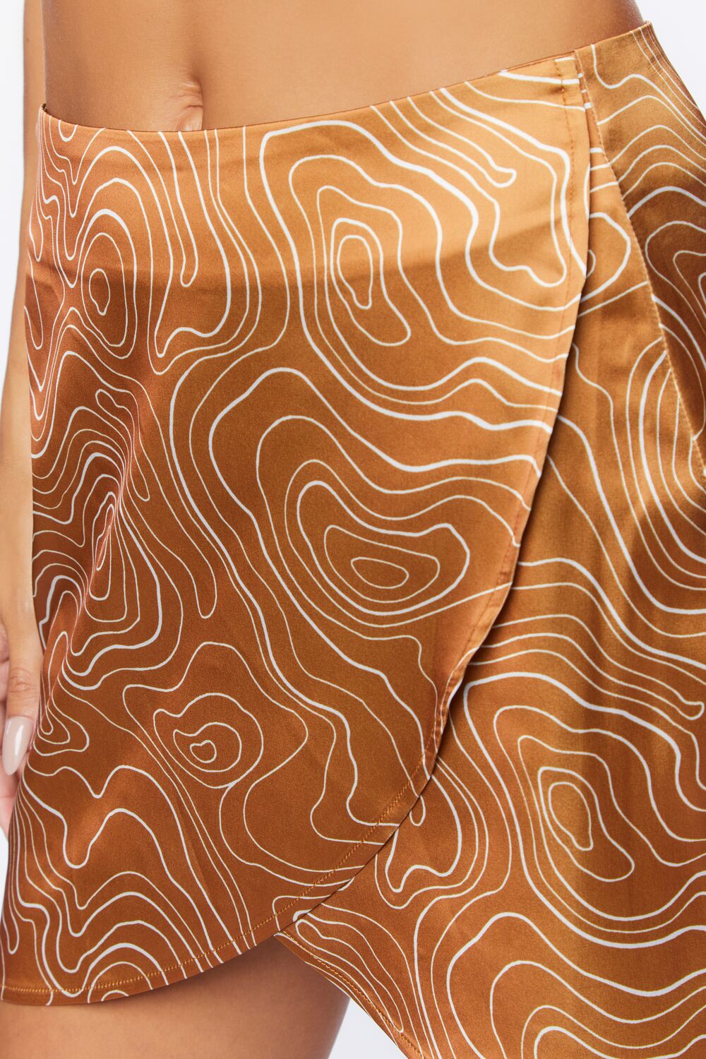 A woven mini skirt featuring an allover abstract print. mock wrap design. a high rise. and a tulip hem.