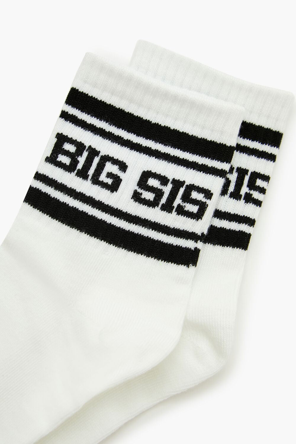 A set of knit socks featuring a quarter length. ribbed trim. and ‘Big Sis’ and ‘Lil Sis’ text.