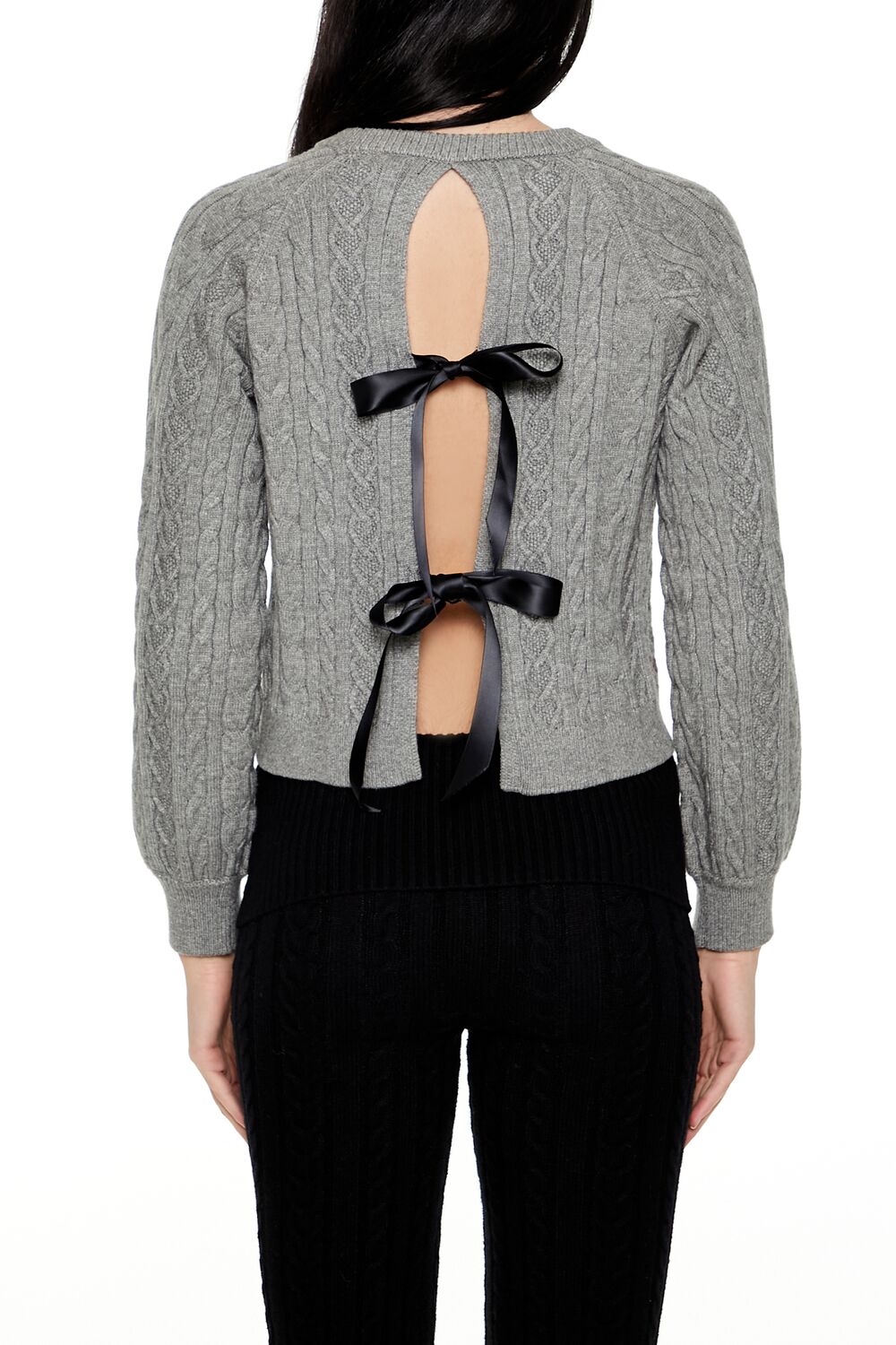 A cable knit sweater featuring an self-tie back bow closures. long sleeves. a cropped hem. and round neckline.