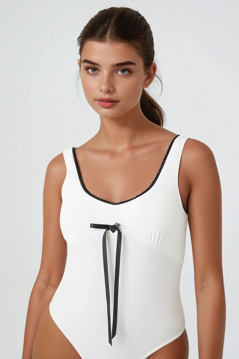 A knit bodysuit featuring shoulder straps. a scoop neckline and back. contrasting ricrac trim. and a front ribbon bow embellishment.