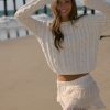 A cable knit set featuring ribbed trim. a sweater dress with a straight-cut neckline and back. thick cami straps. mini length. and bodycon silhouette. as well as a matching shrug sweater with long dolman sleeves and an open front.