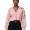 A knit sweater featuring ribbed trim. a crew neck. front candy cane graphics. long sleeves. and cropped hem.