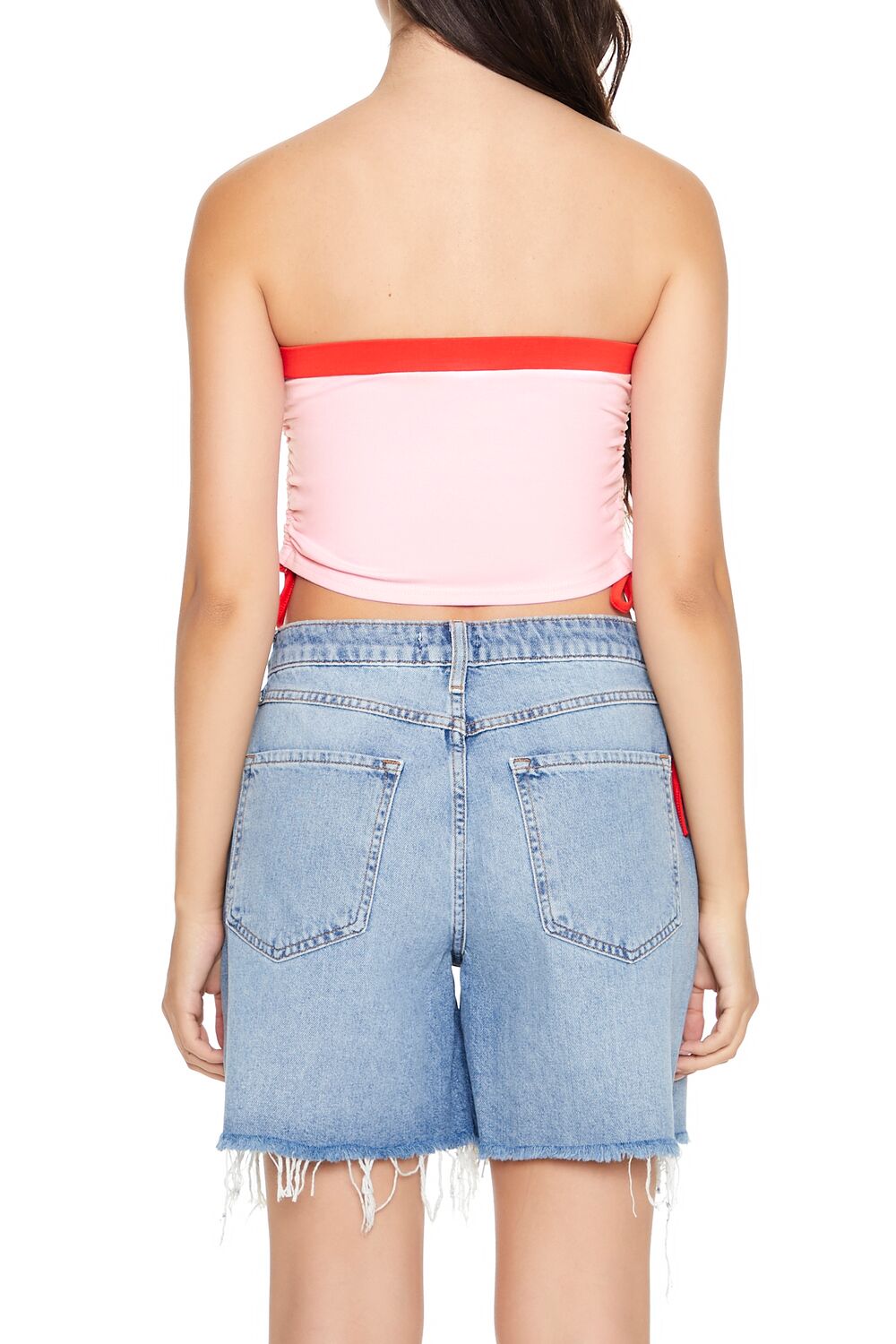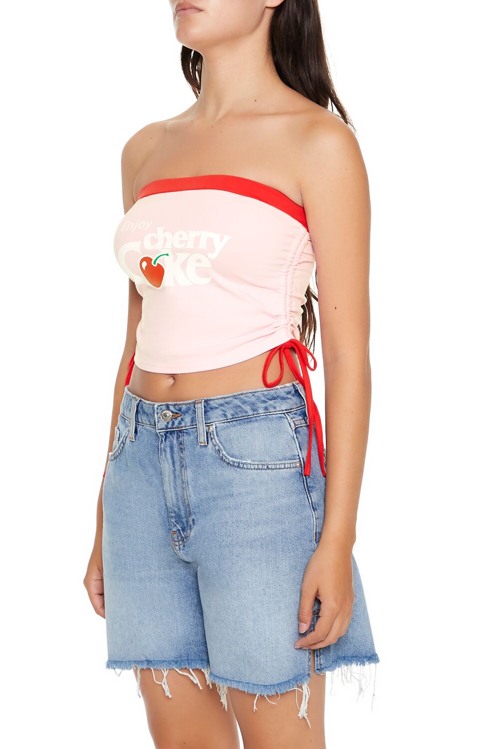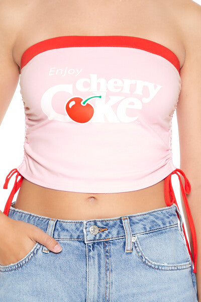 A knit tube top featuring contrasting trim. front ‘Enjoy Cherry Coke’ text. ruched drawstring sides. a straight-cut neckline and back. and a cropped hem.