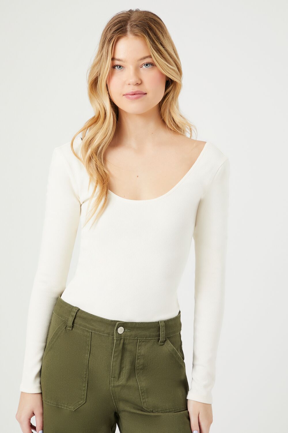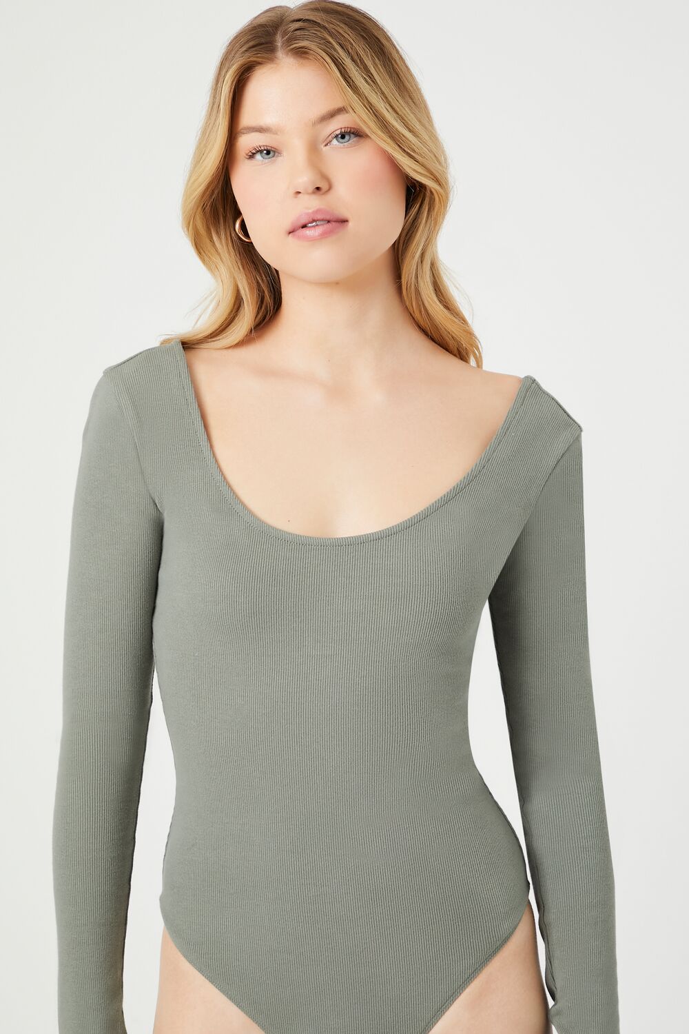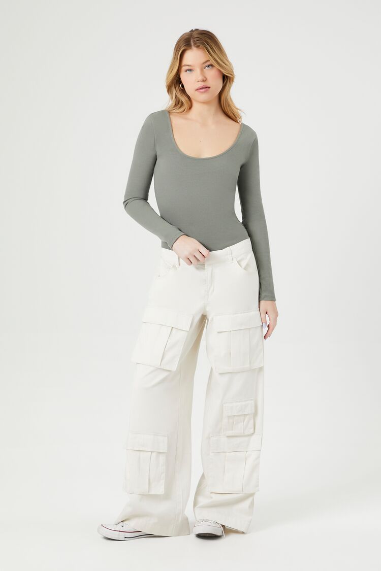 A knit cotton-blend bodysuit featuring a scoop neckline and back and long sleeves.