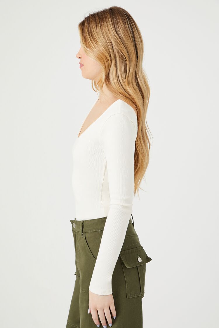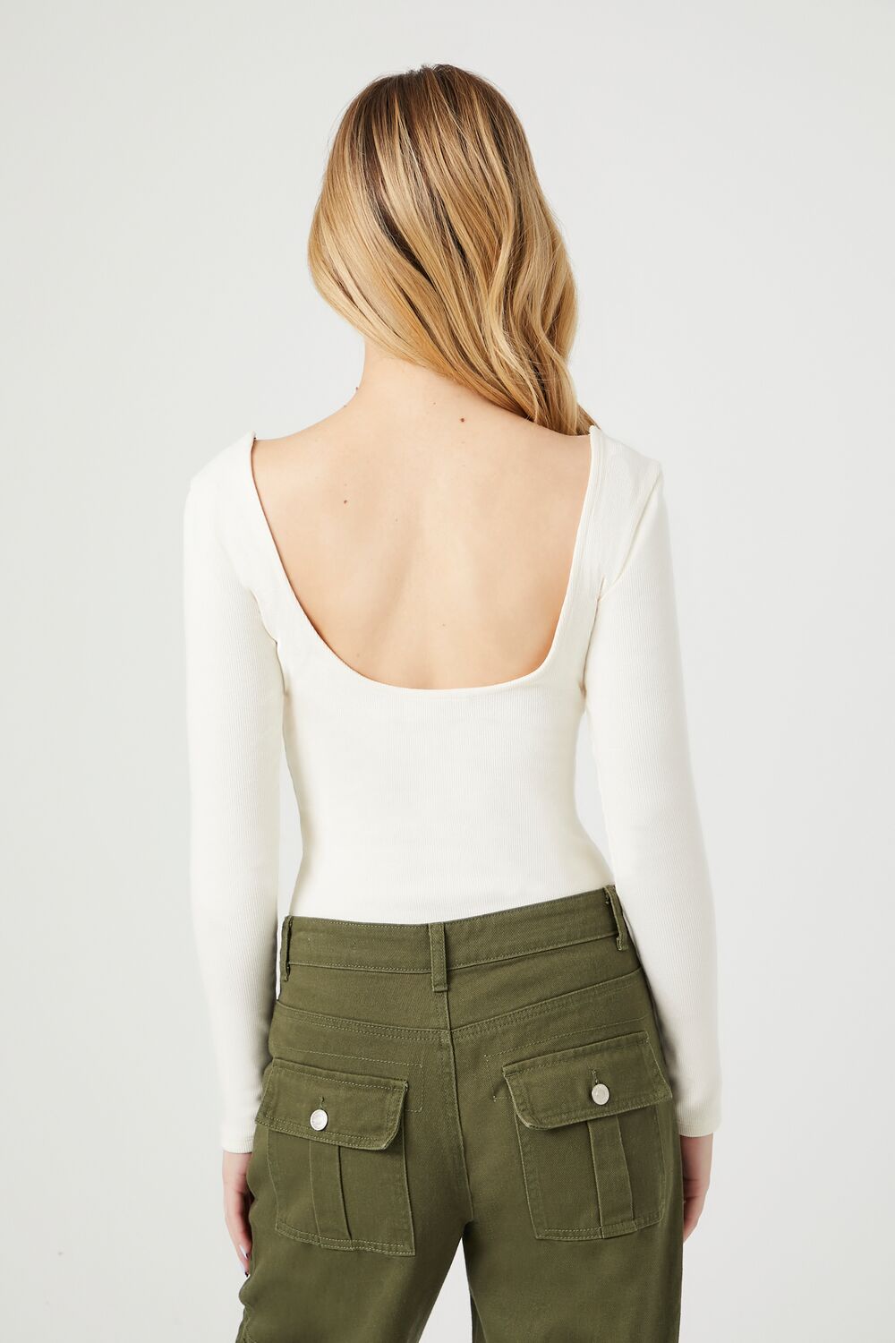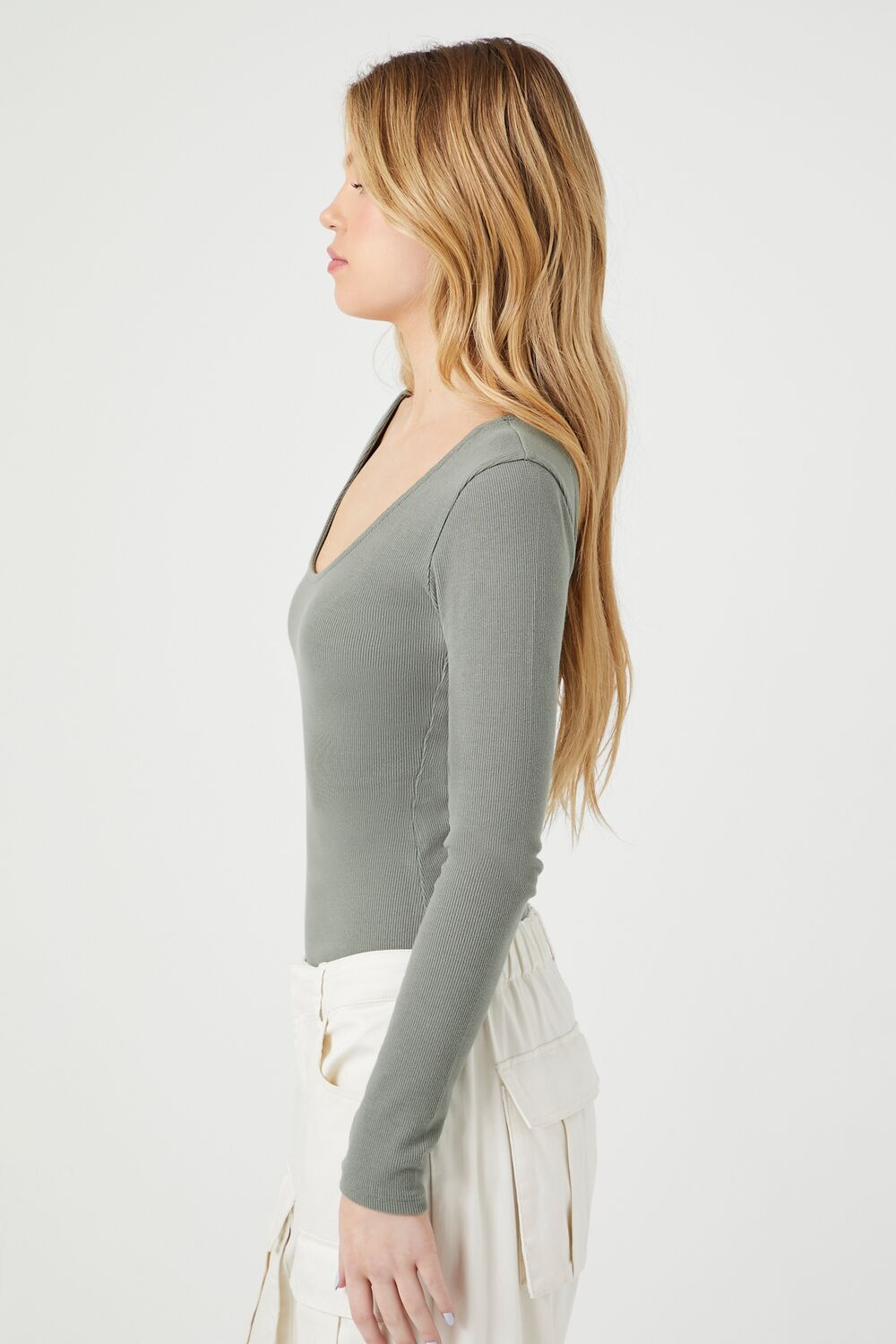 A knit cotton-blend bodysuit featuring a scoop neckline and back and long sleeves.
