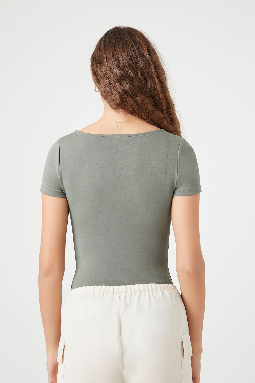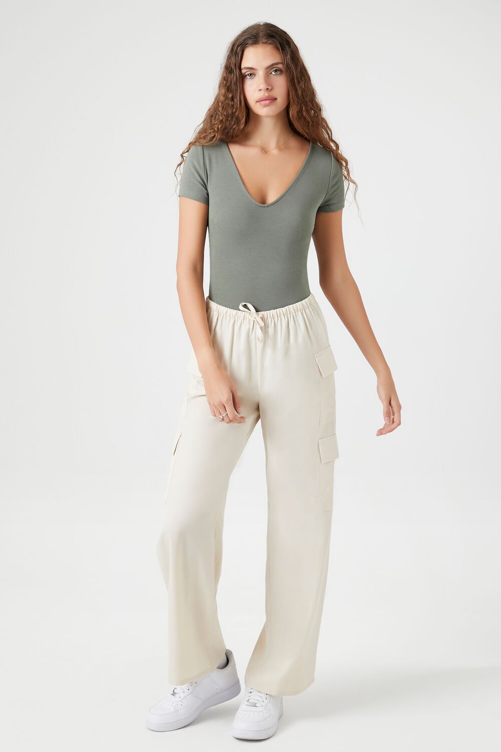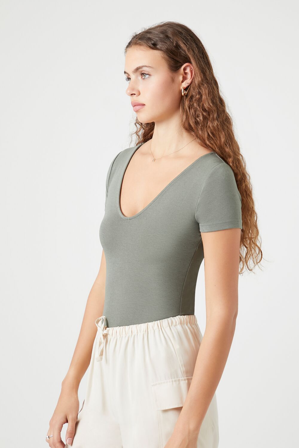 A cotton-blend bodysuit featuring a V-neckline. short sleeves. and fitted silhouette.
