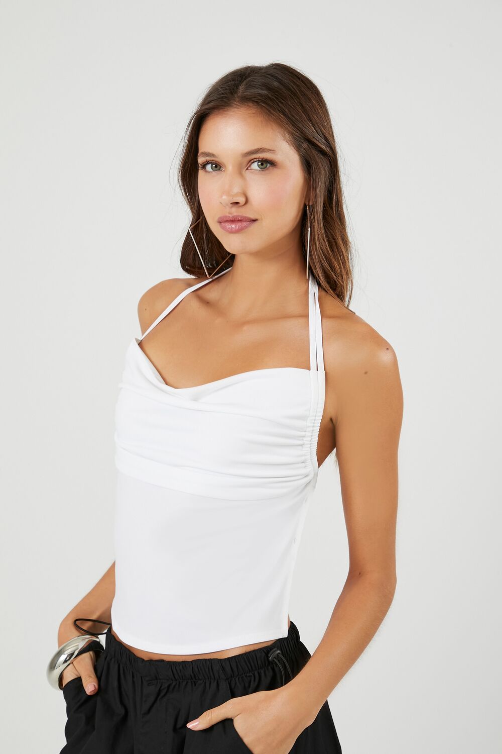 A knit top featuring a cowl halter neckline. sleeveless cut. and an open back with self-tie closure.