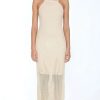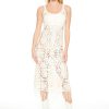 A knit tee featuring a crew neck. dropped short sleeves. lattice crochet design. and elongated fringe trim.