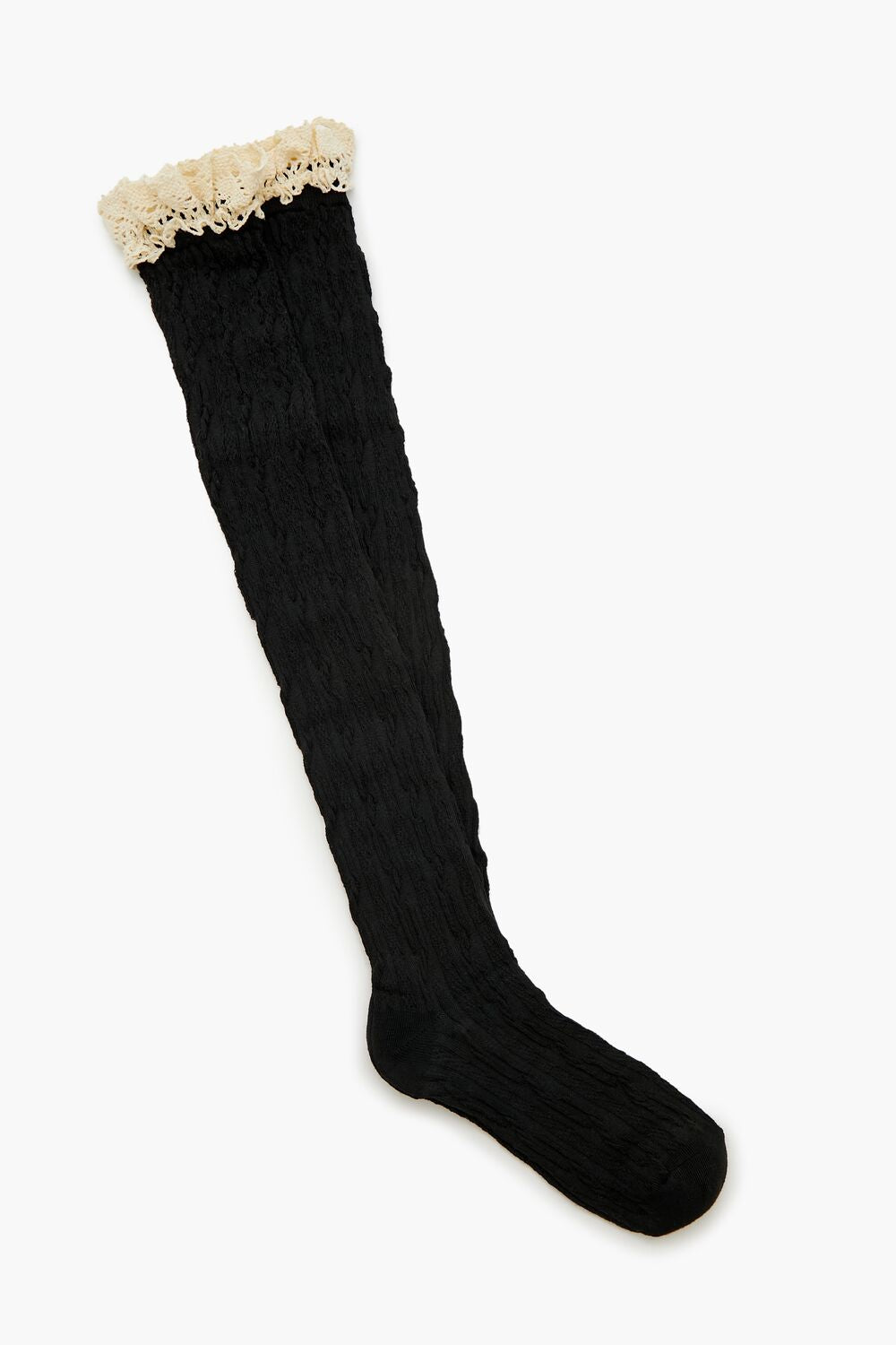 A pair of textured knit thigh-high socks featuring crochet lace trim.