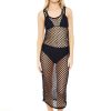 A crochet swim cover-up dress featuring a halter neckline. midi length. open back. dual self-tie back closures. and fringe hem.