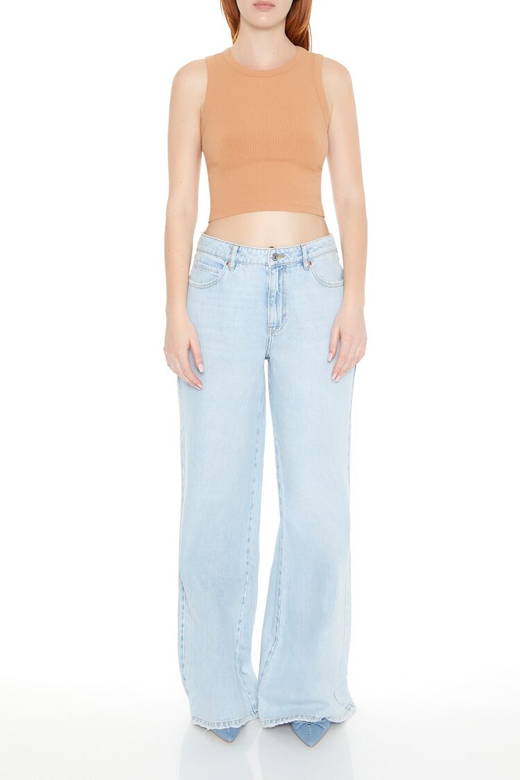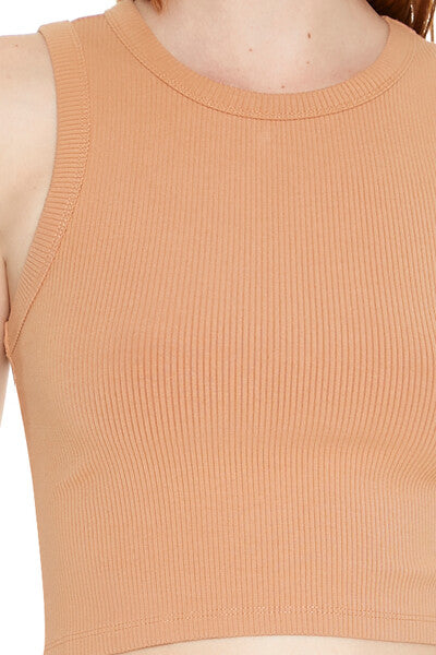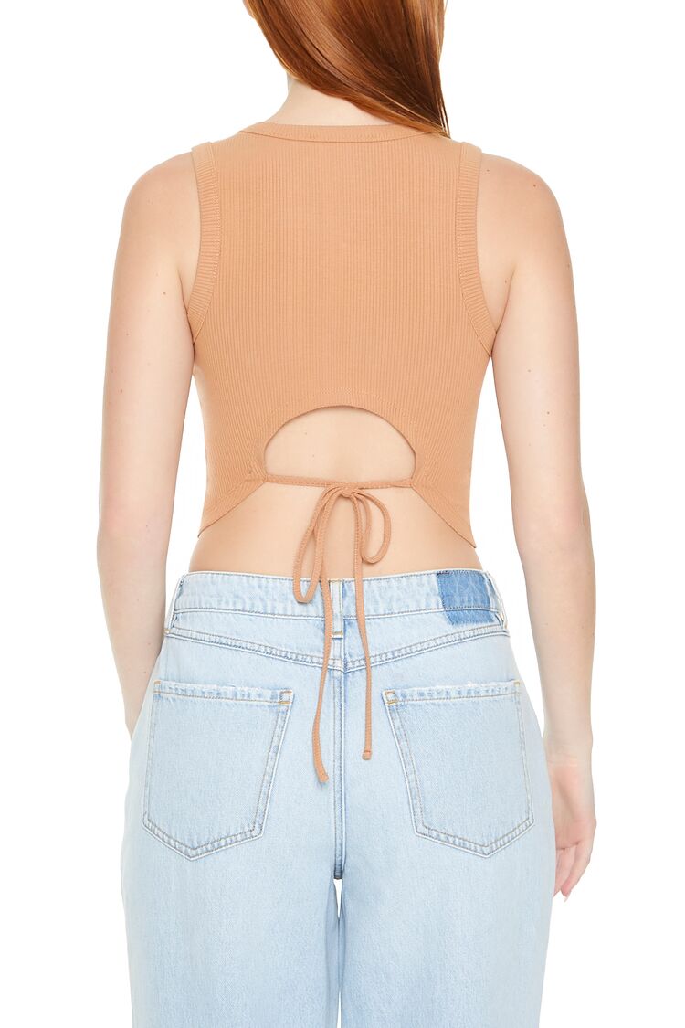 A ribbed knit tank top featuring a round neckline. cropped hem. and back cutout with a self-tie closure.