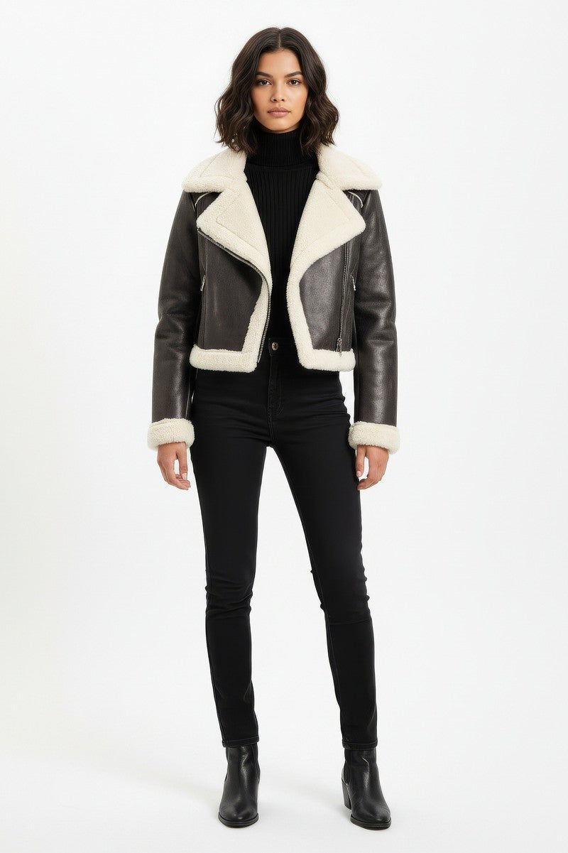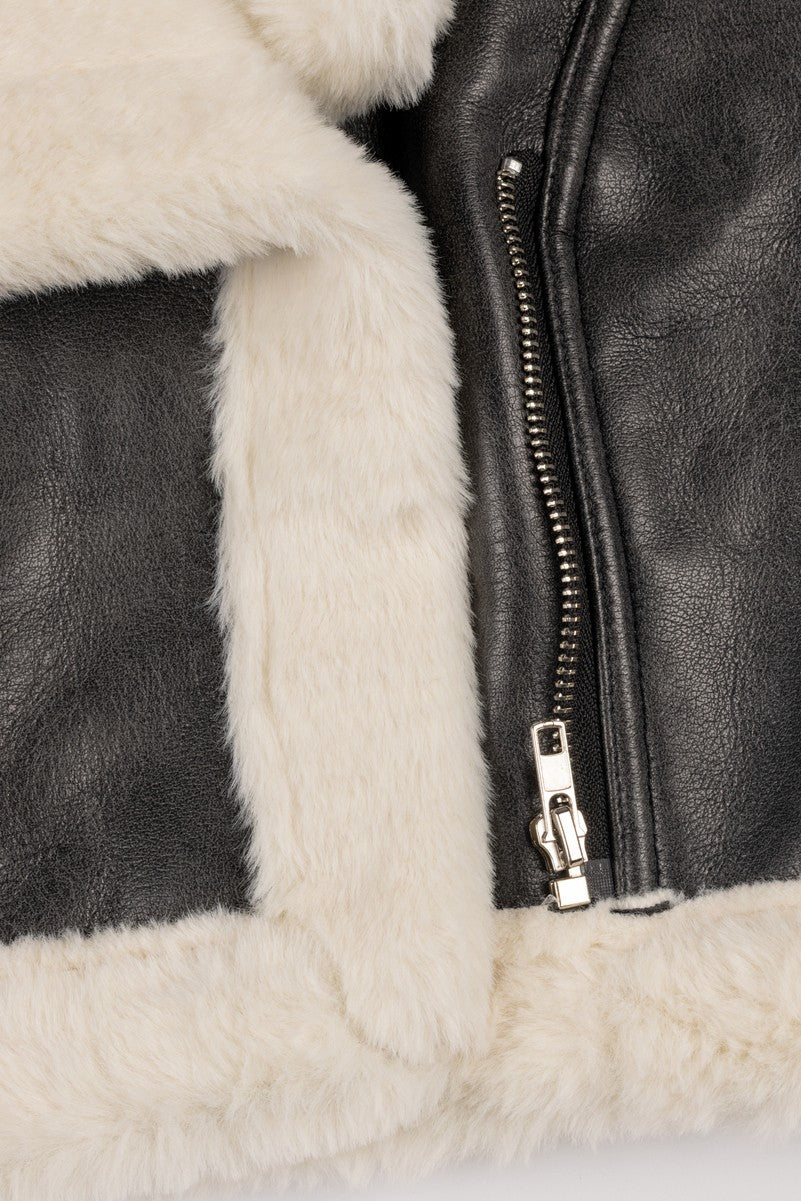 Crafted from soft faux leather with plush shearling-style lining for a cozy. structured look