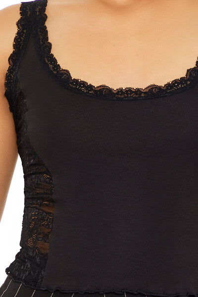 A knit tank top featuring partial lace construction. scoop neckline. shoulder straps. and a cropped hem.