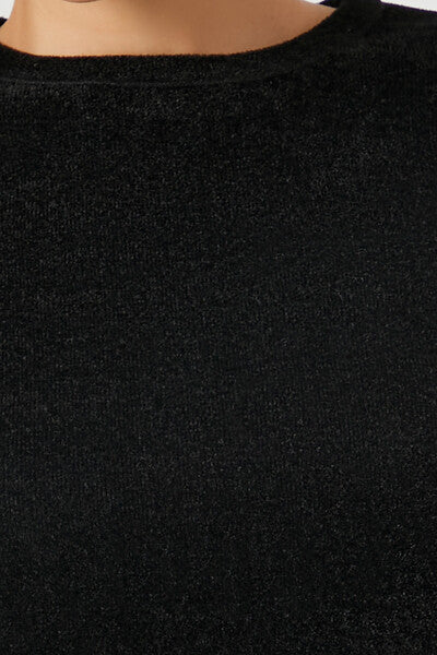 A knit sweater featuring long sleeves. a round neckline. and cropped hem.