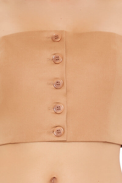 A woven tube top featuring a straight-cut neckline and back. button-front closures. and a cropped hem.