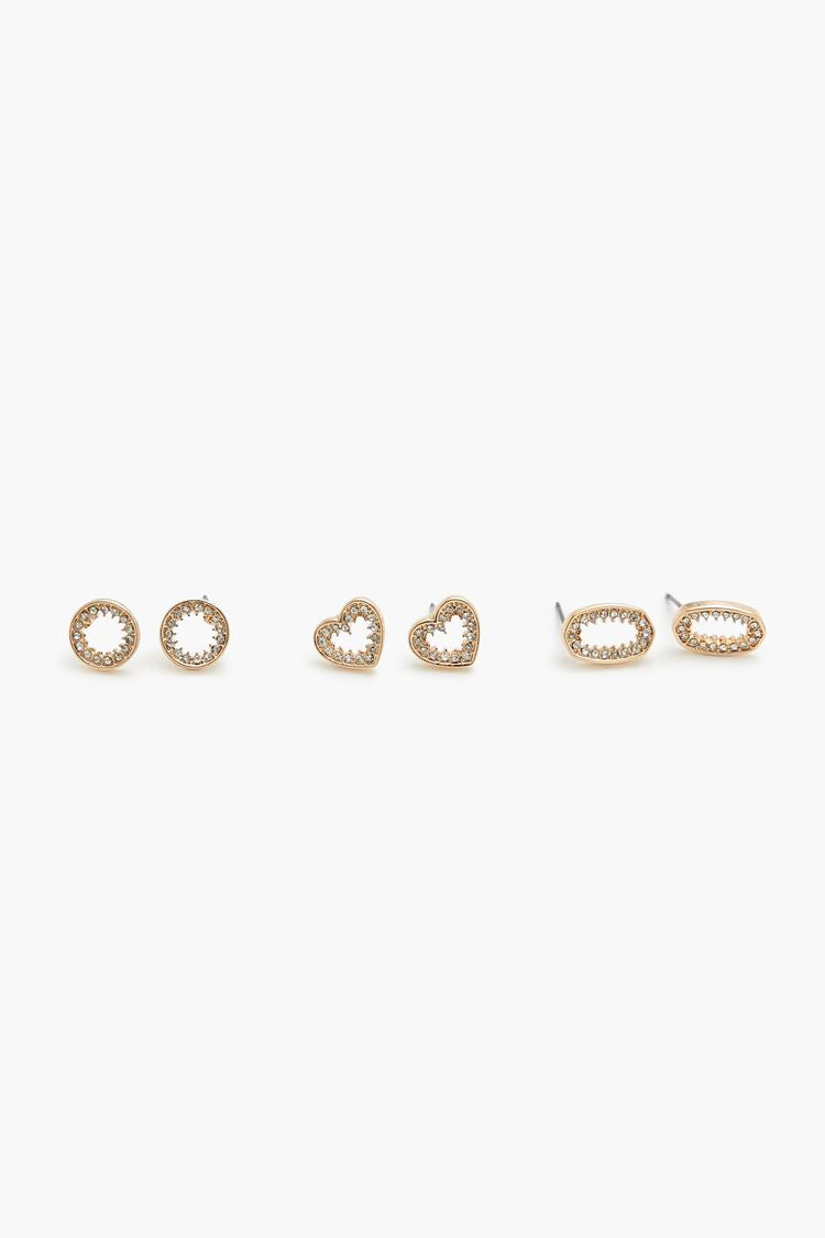 A set of high-polish stud earrings featuring heart and geometric cutout designs. rhinestone embellishments. and post-back closures.