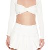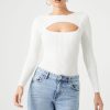 A sweater-knit crop top featuring an allover striped pattern. ribbed construction. chest cutout. long sleeves. fitted silhouette. and a round neckline.