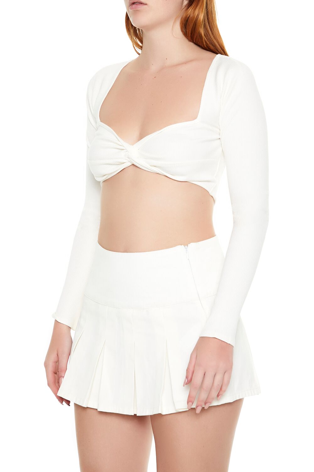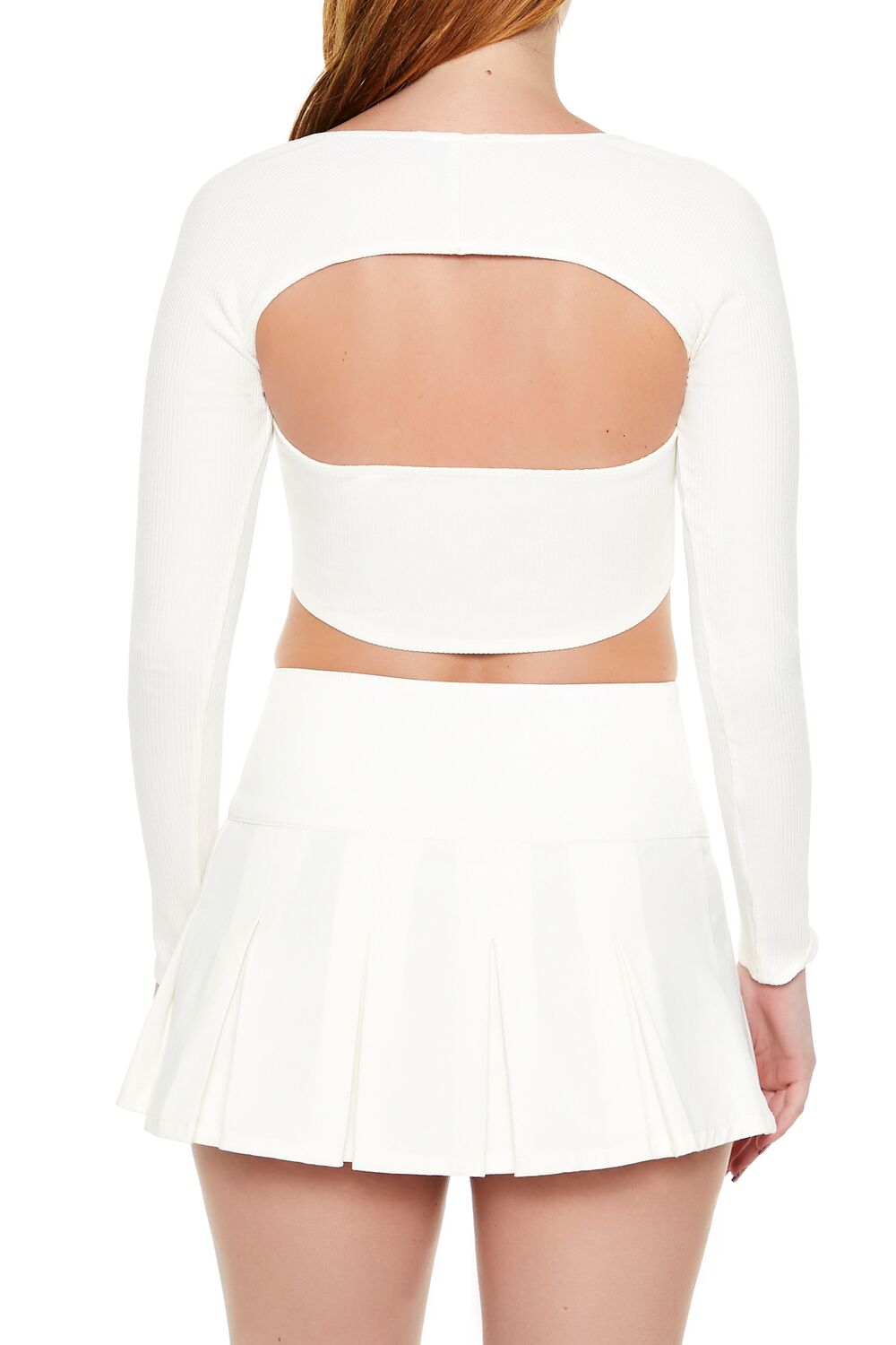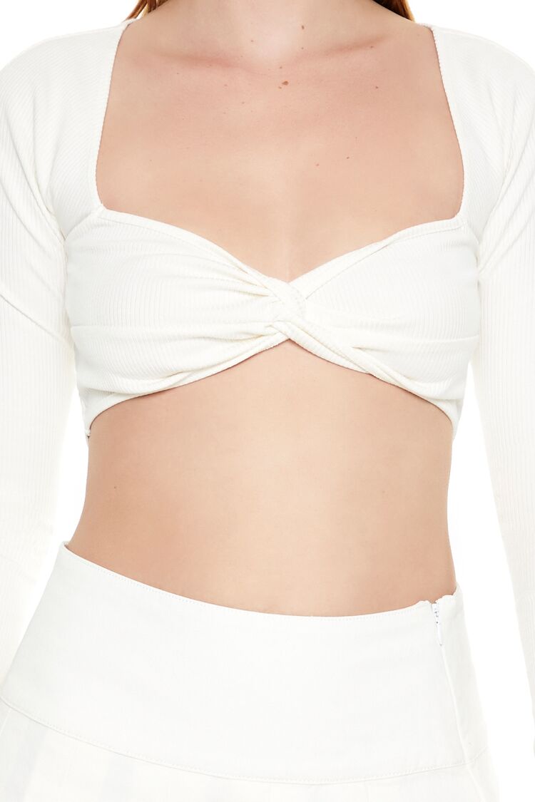 A ribbed knit crop top featuring long sleeves. a sweetheart neckline. twisted front. and a back cutout.