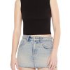 A jersey knit tank bodysuit featuring a round neckline. back cutout with twist design. and snap-button closures.