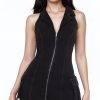 A denim crop top featuring a square-cut neckline and back. corset-inspired design. fixed shoulder straps. an exposed back zipper. and a curved hem.