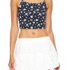 A chiffon mini dress featuring an allover ditsy floral print. square-cut neckline. straight-cut back. ruffle trim. adjustable cami straps. layered design. concealed zippered back closure. tiered construction. and fit and flare silhouette.
