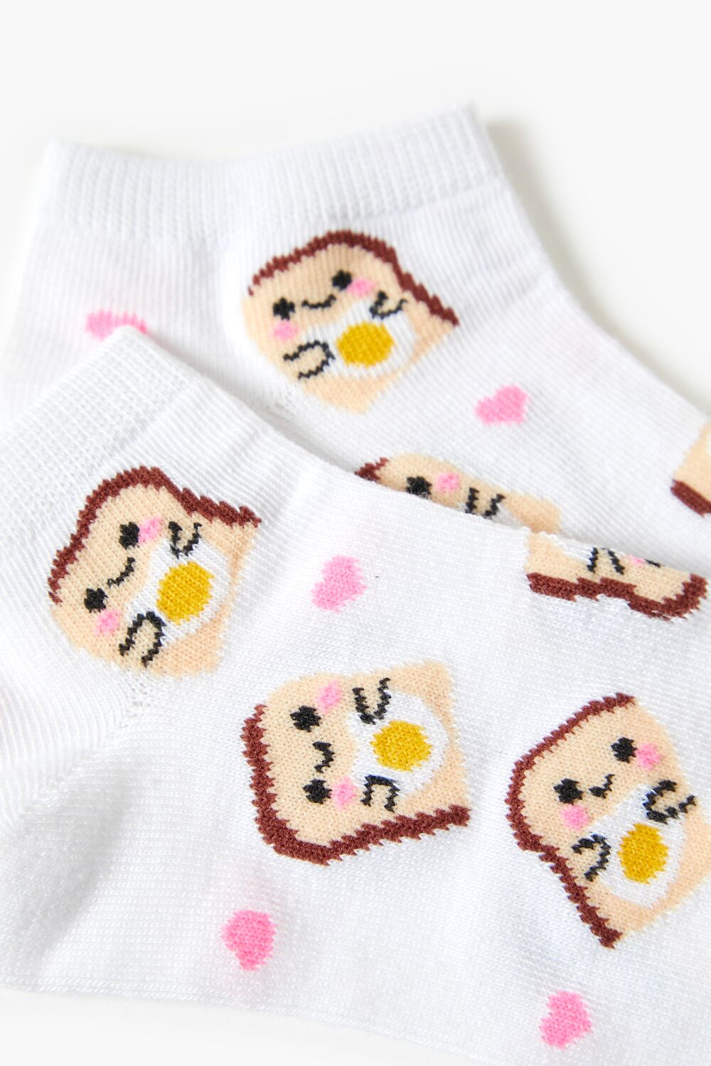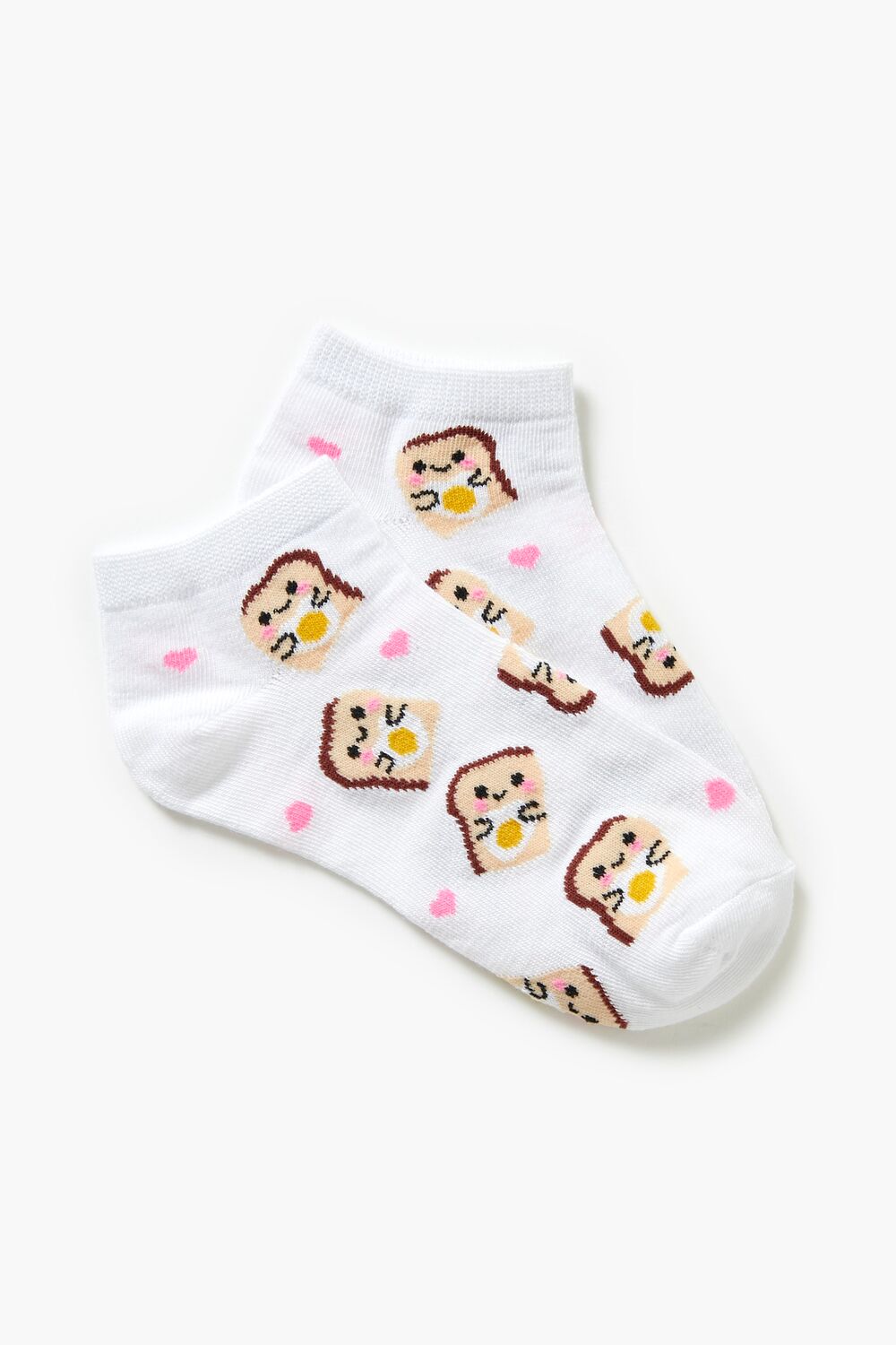 A pair of knit ankle socks featuring an allover egg toast and heart print.