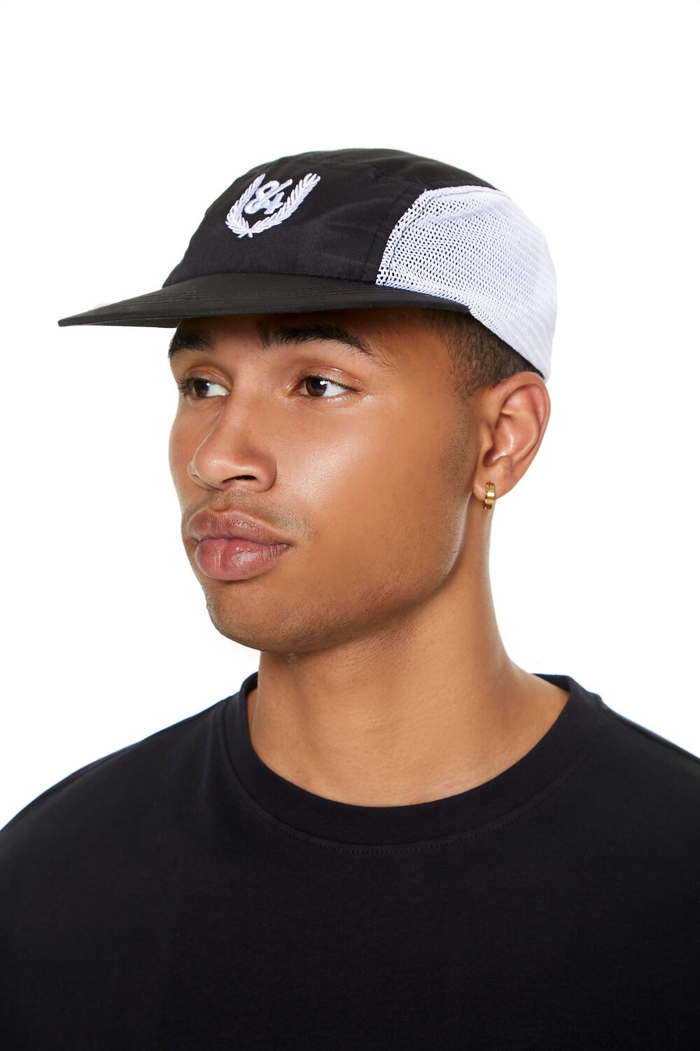 A woven baseball cap featuring a colorblock design. partial mesh construction. and ’84’ embroidery.