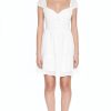 An eyelash lace mini dress featuring a straight-cut neckline and back. princess seams. velvet bow chest embellishments. adjustable cami straps. concealed zipper back closure. and A-line silhouette.