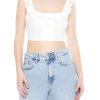 A ribbed knit bikini top featuring an allover embroidered eyelet pattern. plunging halter neckline. front high-polish O-ring accent. triangle silhouette. and back self-tie closures.