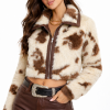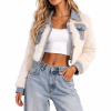 A faux leather trucker jacket featuring faux fur trim. a basic collar. button-front closures. chest flap pockets. long sleeves. and cropped hem.