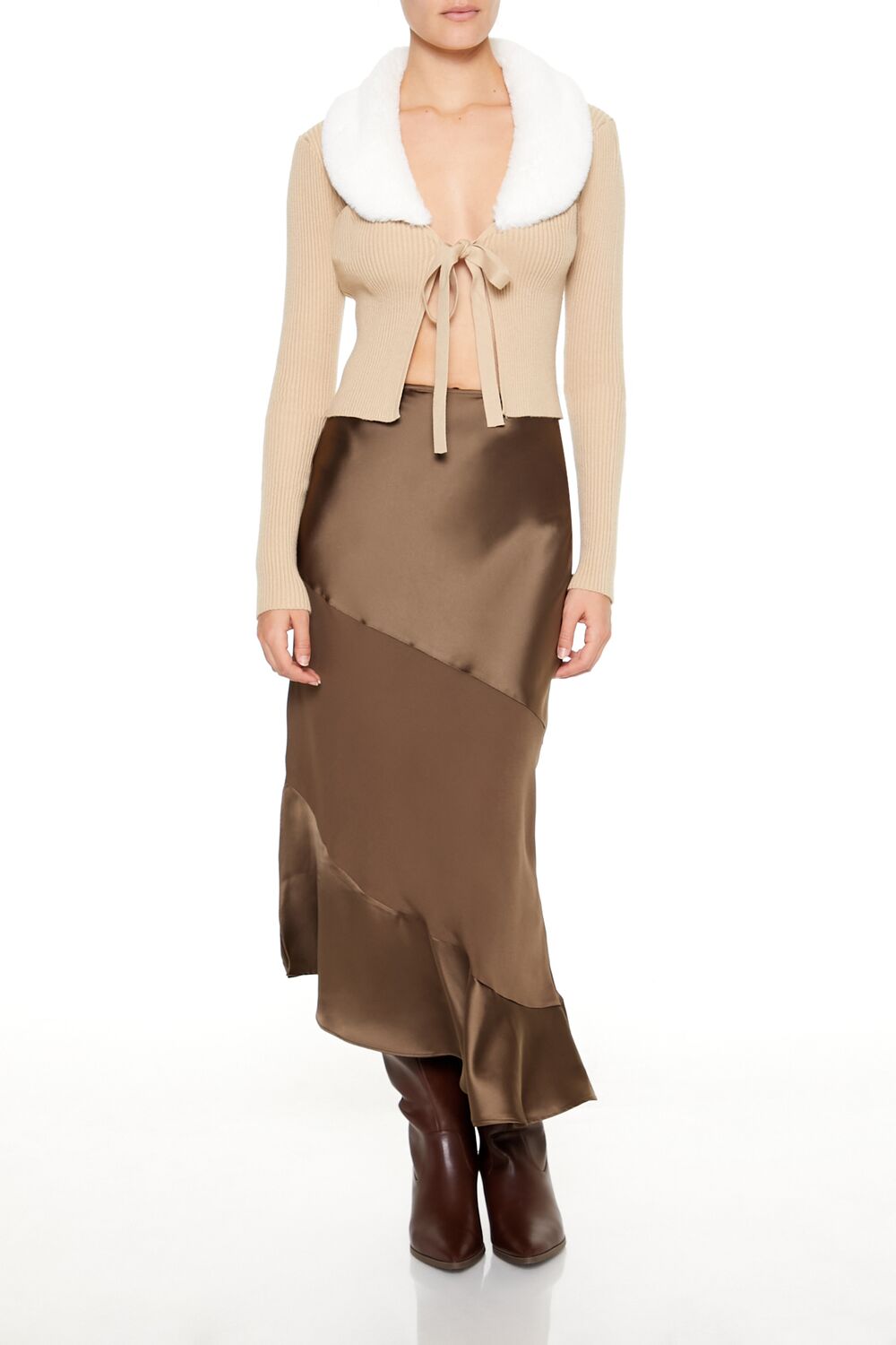 A knit cardigan sweater featuring contrasting faux fur trim. a plunging neckline. allover ribbed construction. self-tie front closure. and a split hem.