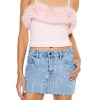 A cable knit sweater featuring ribbed trim. long sleeves. faux gem shoulder embellishments. and a semi-cropped hem.