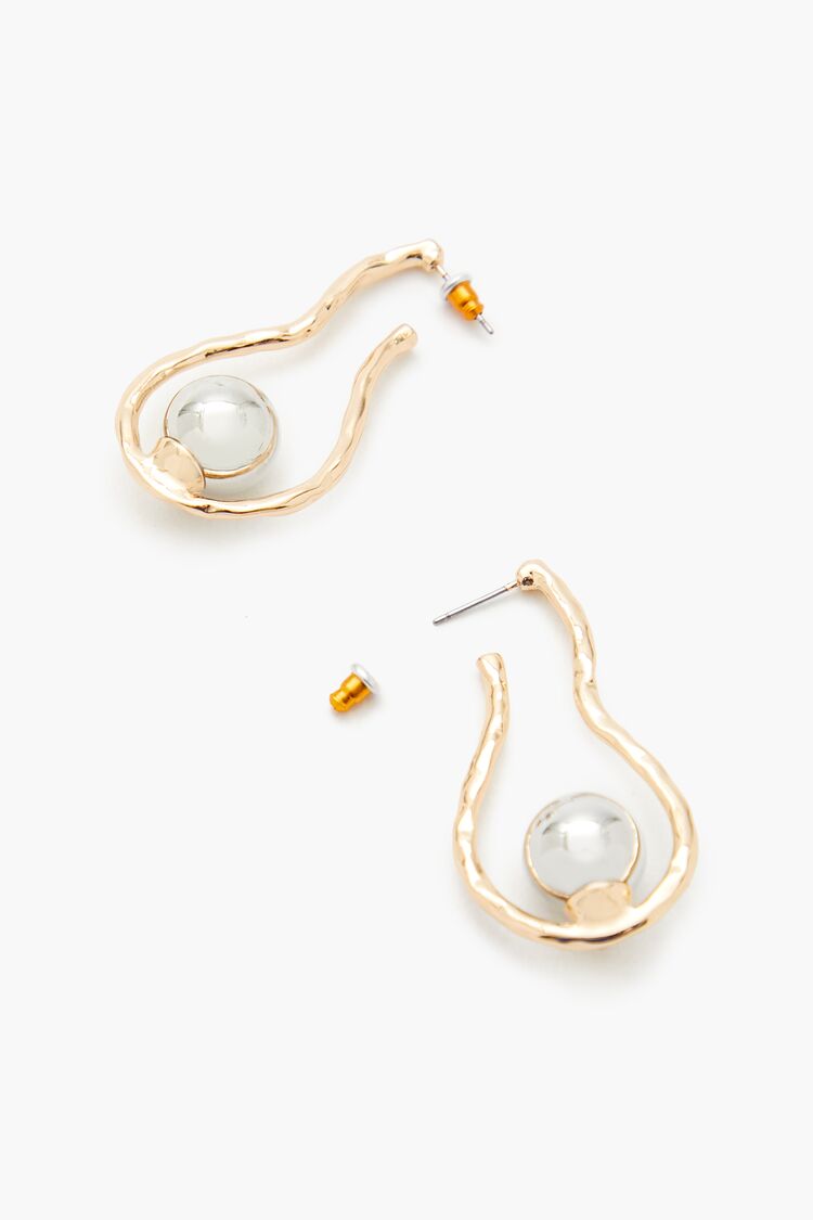 A pair of high-polish drop earrings featuring a geometric construction. hammered finish. faux pearl embellishment. and post-back closures.