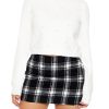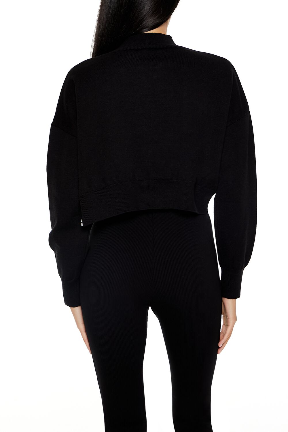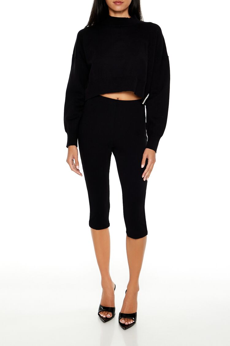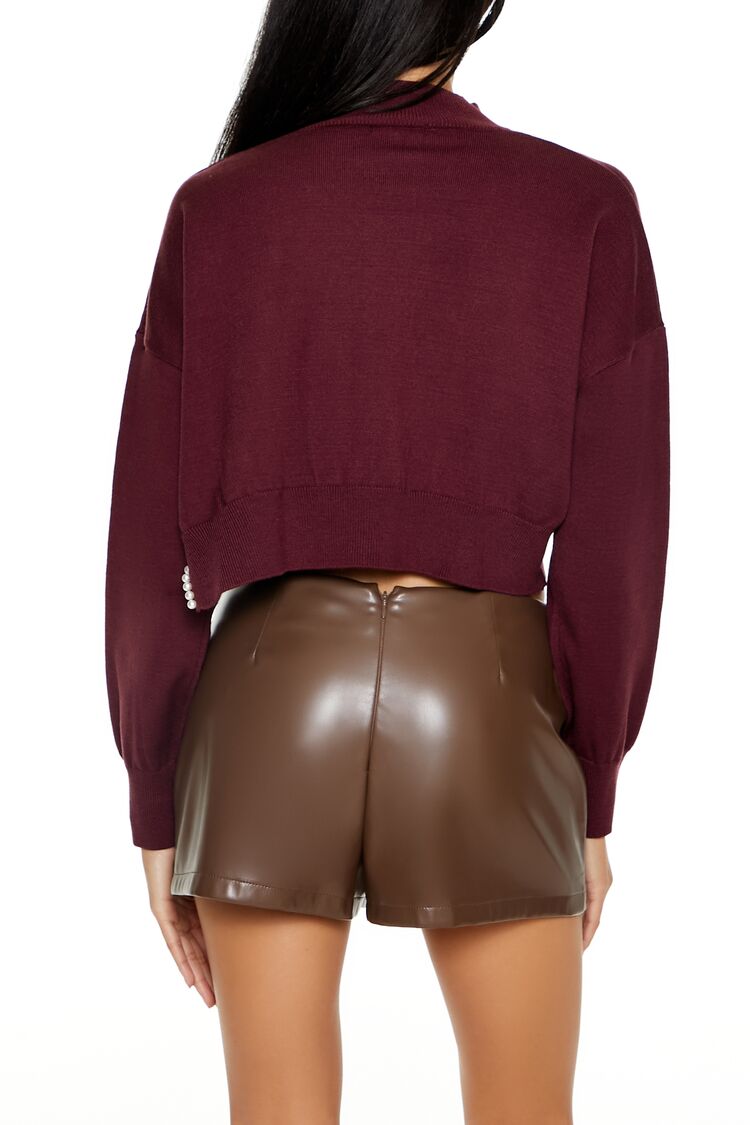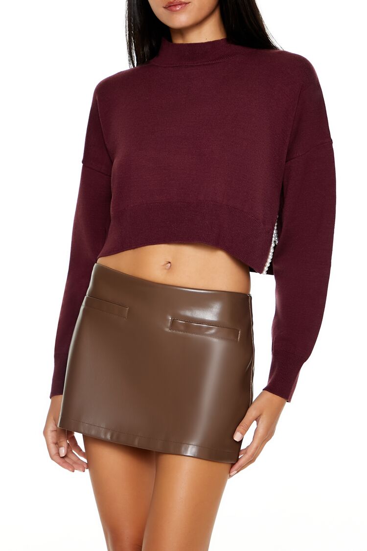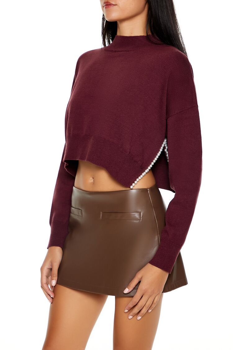 A knit sweater featuring ribbed trim. a mock neck. dropped long sleeves. vented cropped hem. and faux pearl trim.