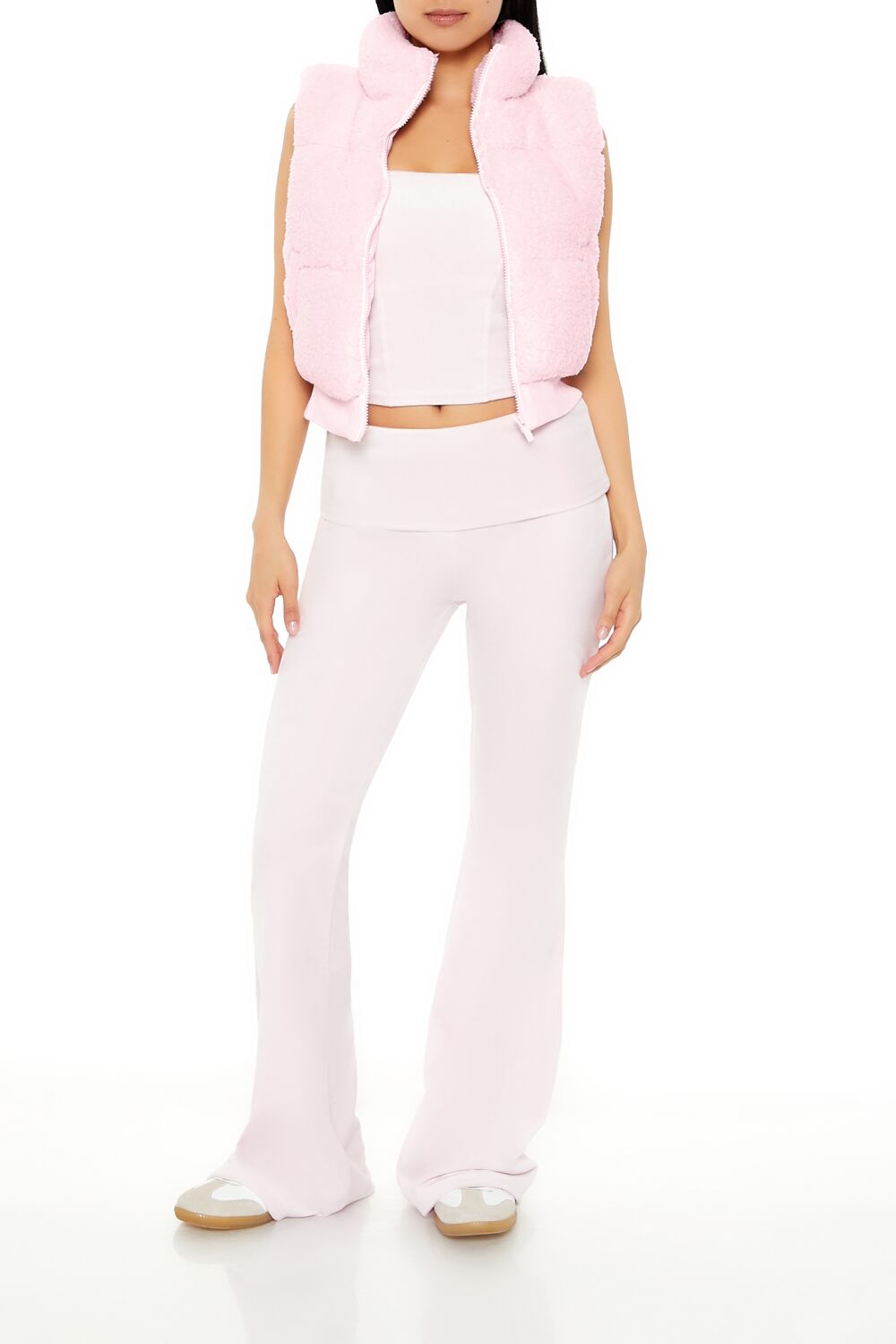 A faux shearling vest featuring a funnel neck. quilted puffer design. zip-up closure. and a semi-cropped hem.