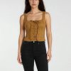 A faux suede trench coat featuring a notched collar. double-breasted construction. drawstring waist with self-tie closure. epaulettes. long sleeves with buttoned straps at the cuffs. back storm flap. and cropped hem.