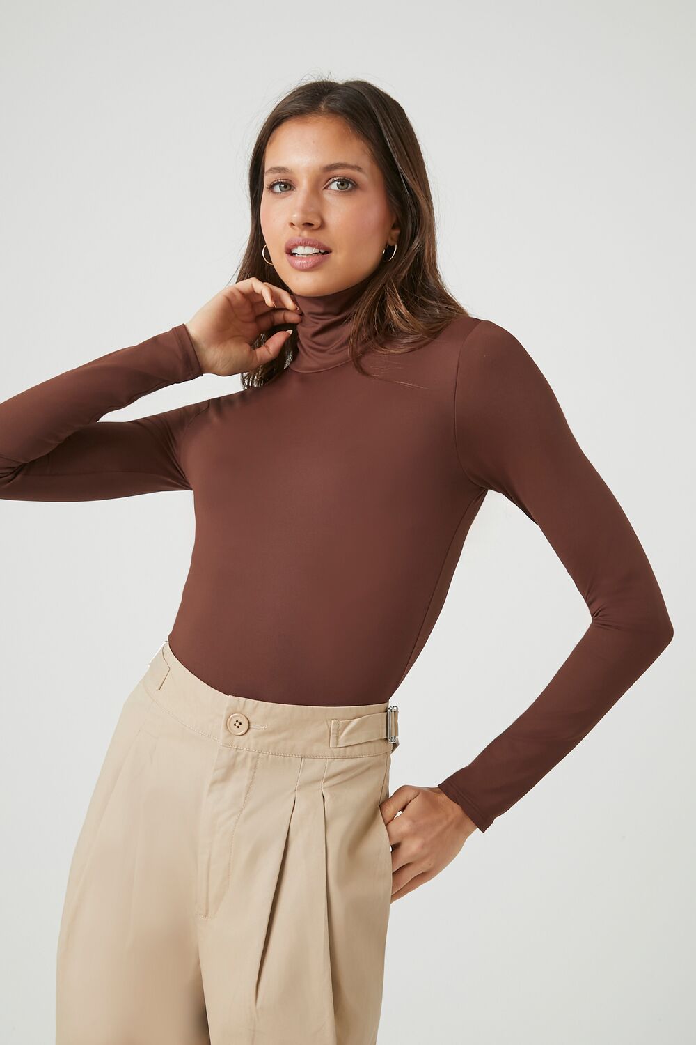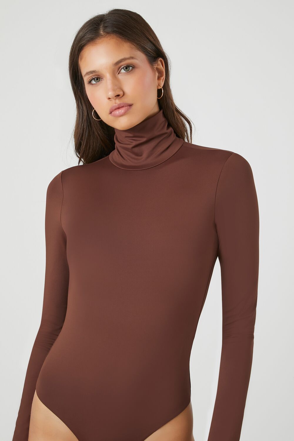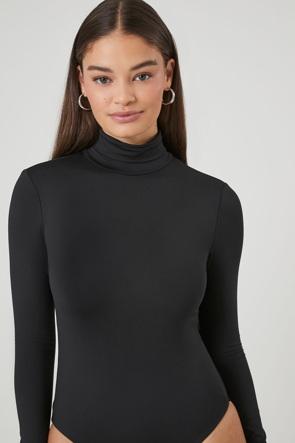 A knit bodysuit featuring a mock neck. long sleeves. and a fitted silhouette.