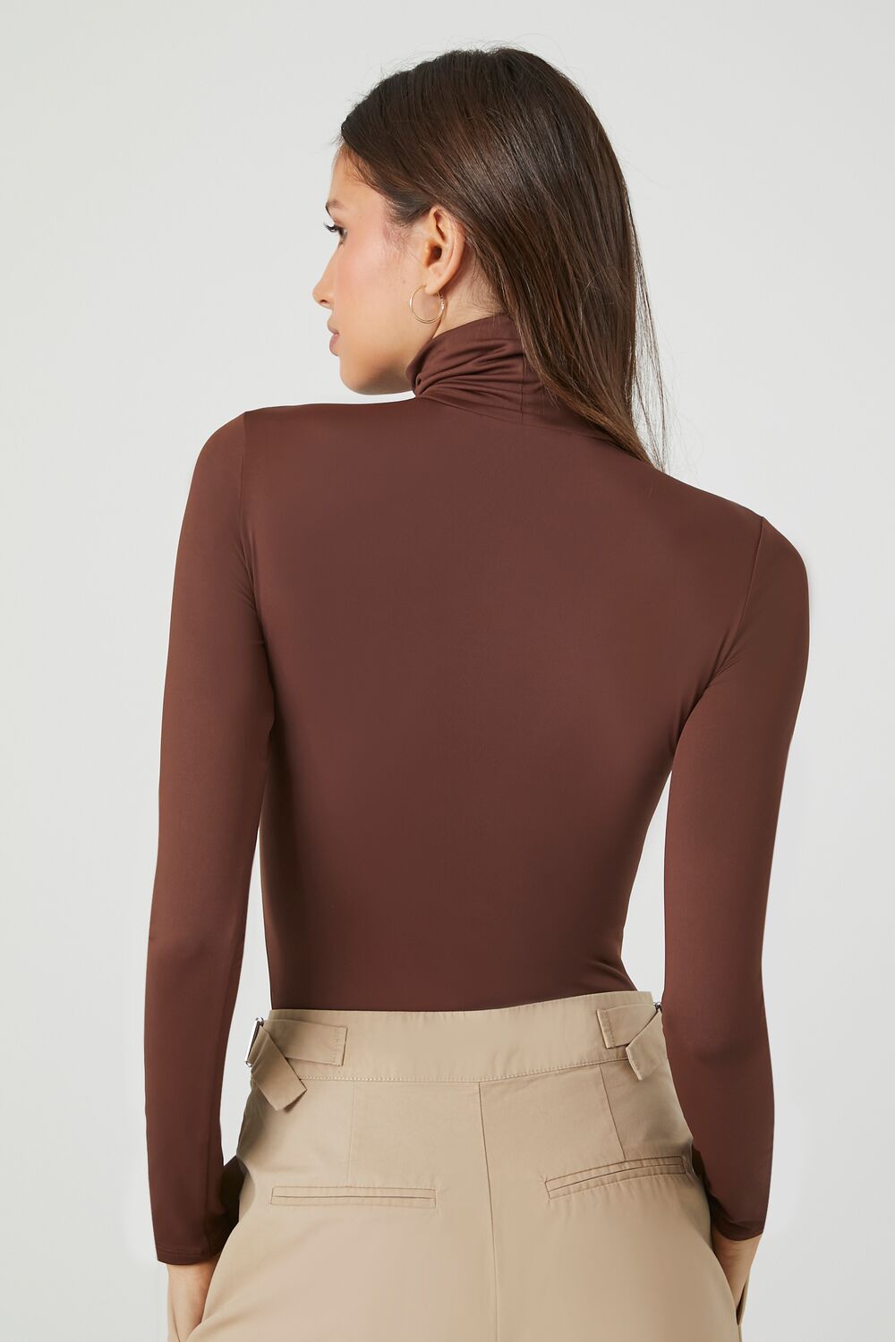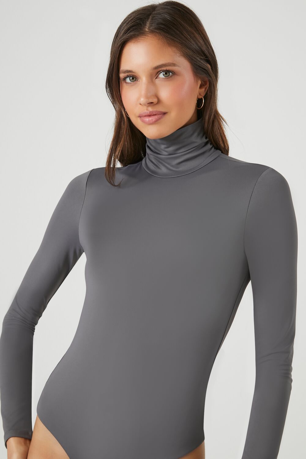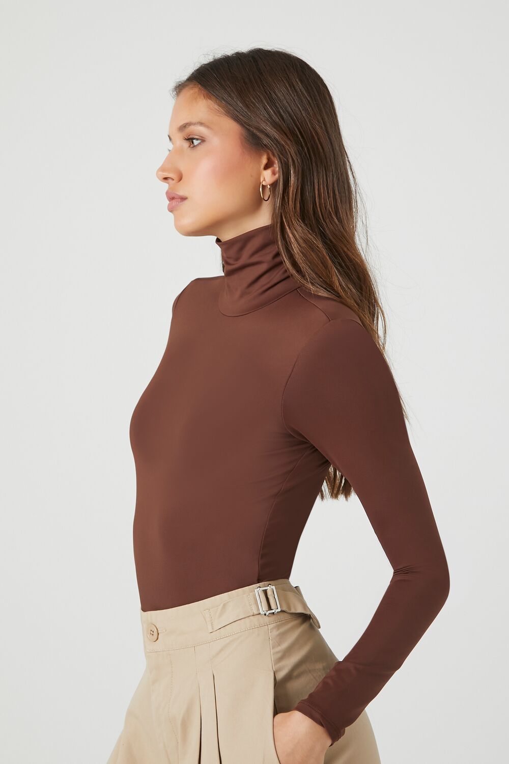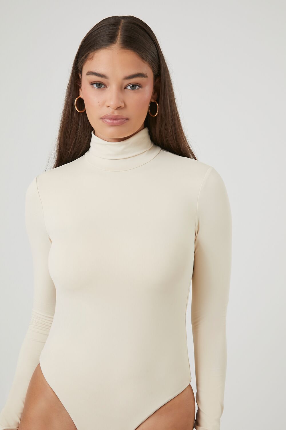 A knit bodysuit featuring a mock neck. long sleeves. and a fitted silhouette.