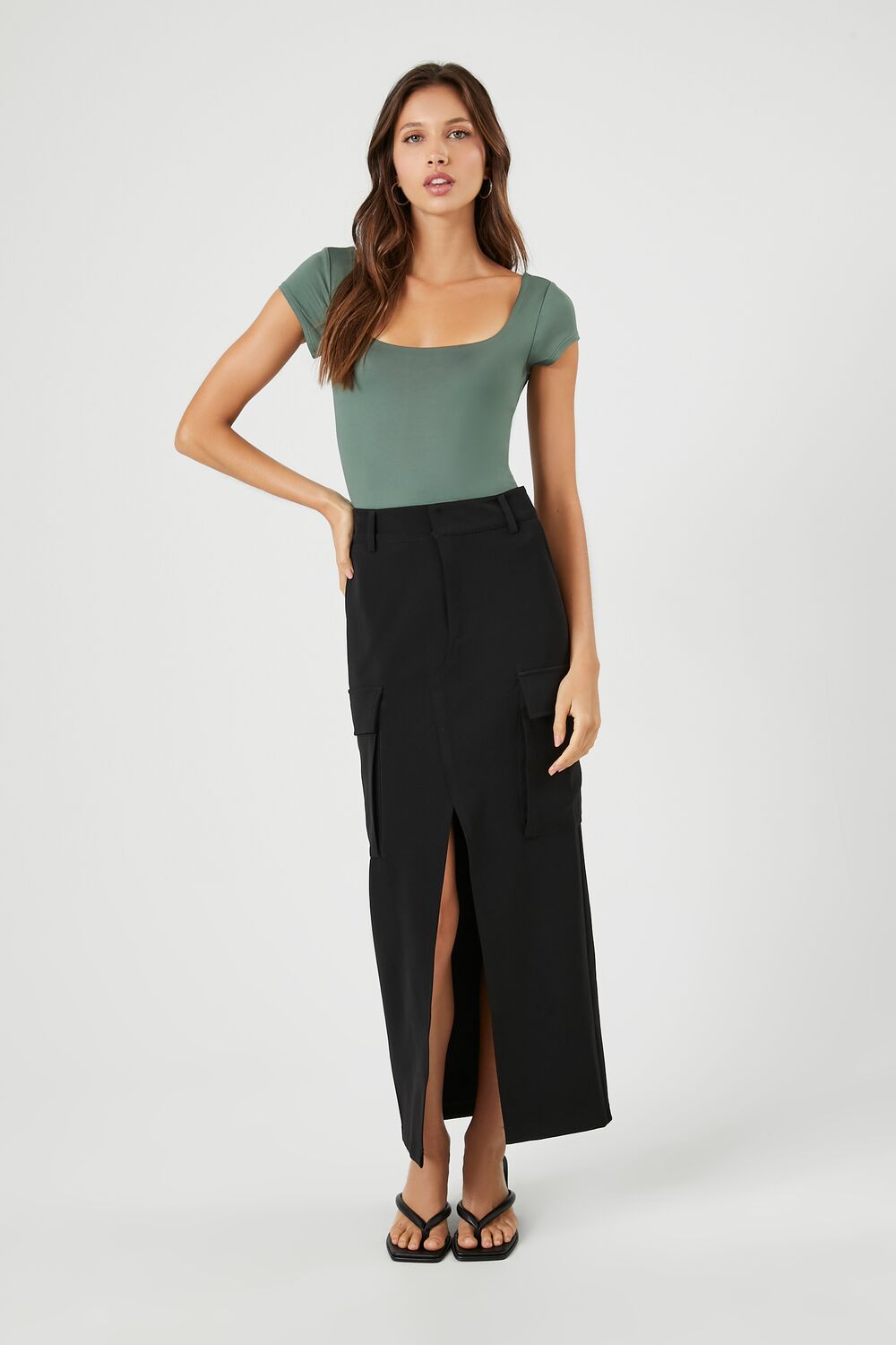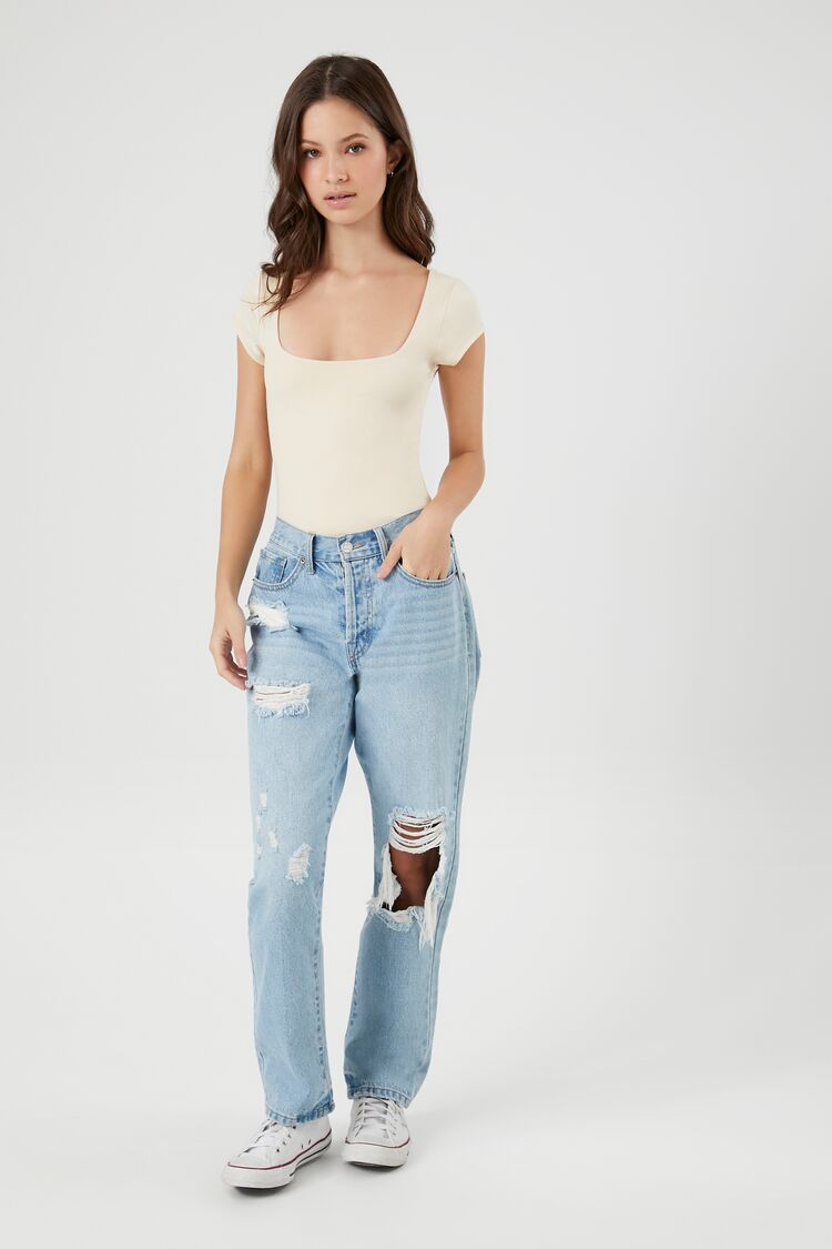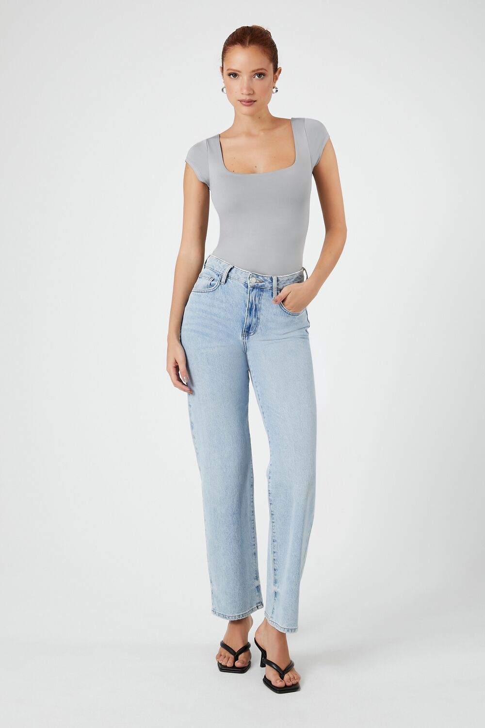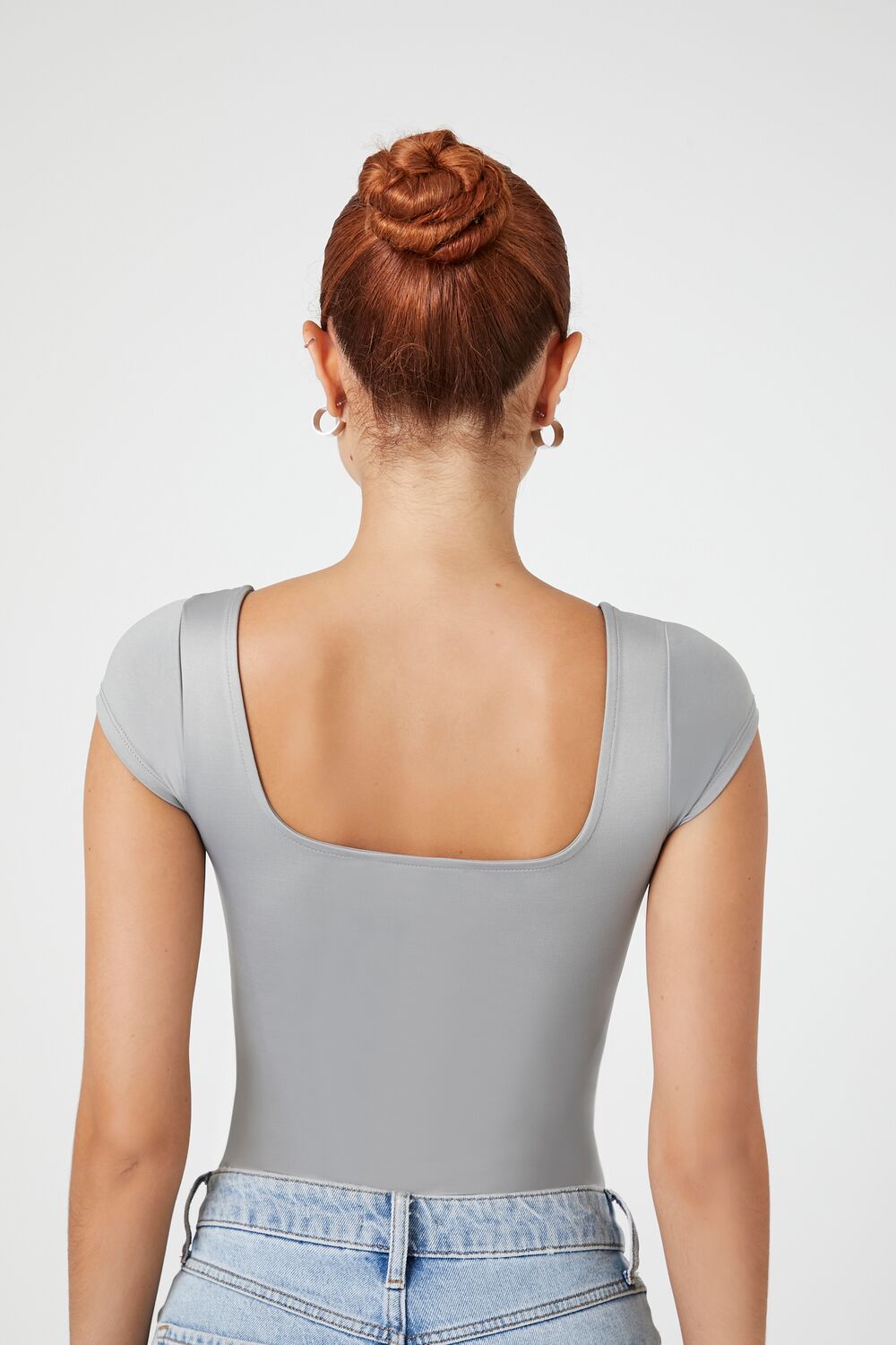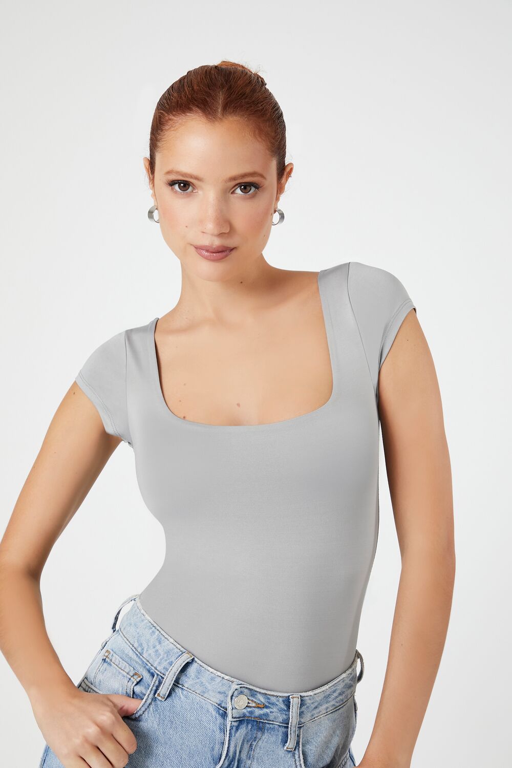 A knit tee bodysuit featuring short sleeves. a fitted silhouette. and square-cut neckline.