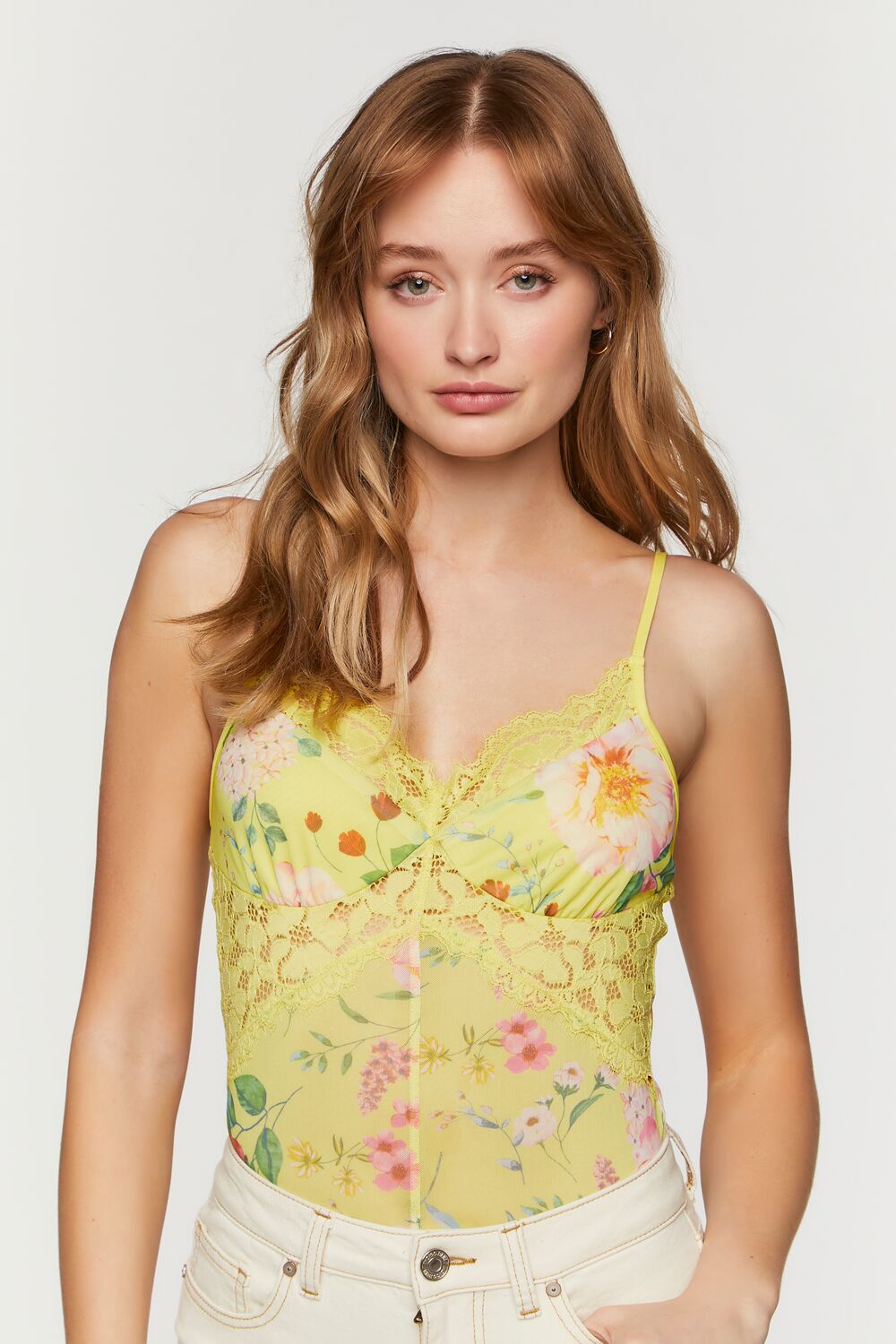 A mesh bodysuit featuring an allover floral print. partial sheer lace construction. sweetheart neckline. straight-cut back. shirred bust. adjustable cami straps. scalloped trim. and snap-button closures.