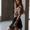 A knit lingerie crop top featuring a corset design. allover ditsy floral print. sweetheart neckline. scalloped lace trim and shoulder straps. princess seams. underwire. boning. square-cut back with hook-and-eye closures. and curved hem.