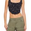 A mesh knit cami featuring an allover floral print. lace trim. sweetheart neckline. cropped hem. fixed straps. and a square-cut back.