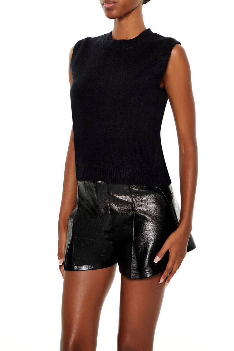 A fuzzy knit sweater vest featuring ribbed trim and a round neckline.