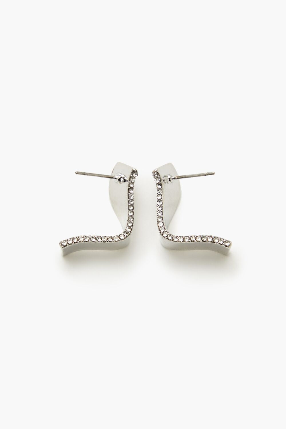 A pair of high-polish stud earrings featuring a geometric twisted design. rhinestone embellishments. and post-back closures.