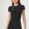 A glitter knit sweater featuring a cable knit construction. long sleeves. a round neckline. rhinestone embellishments. and a cropped hem.
