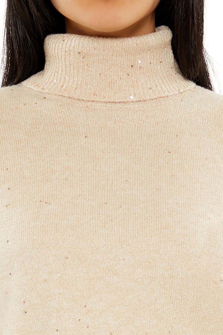 A glitter knit sweater featuring a turtleneck. dropped long sleeves. and ribbed trim.