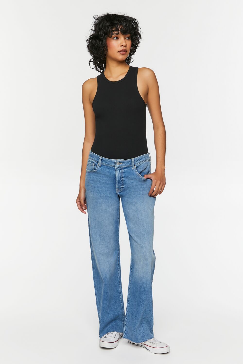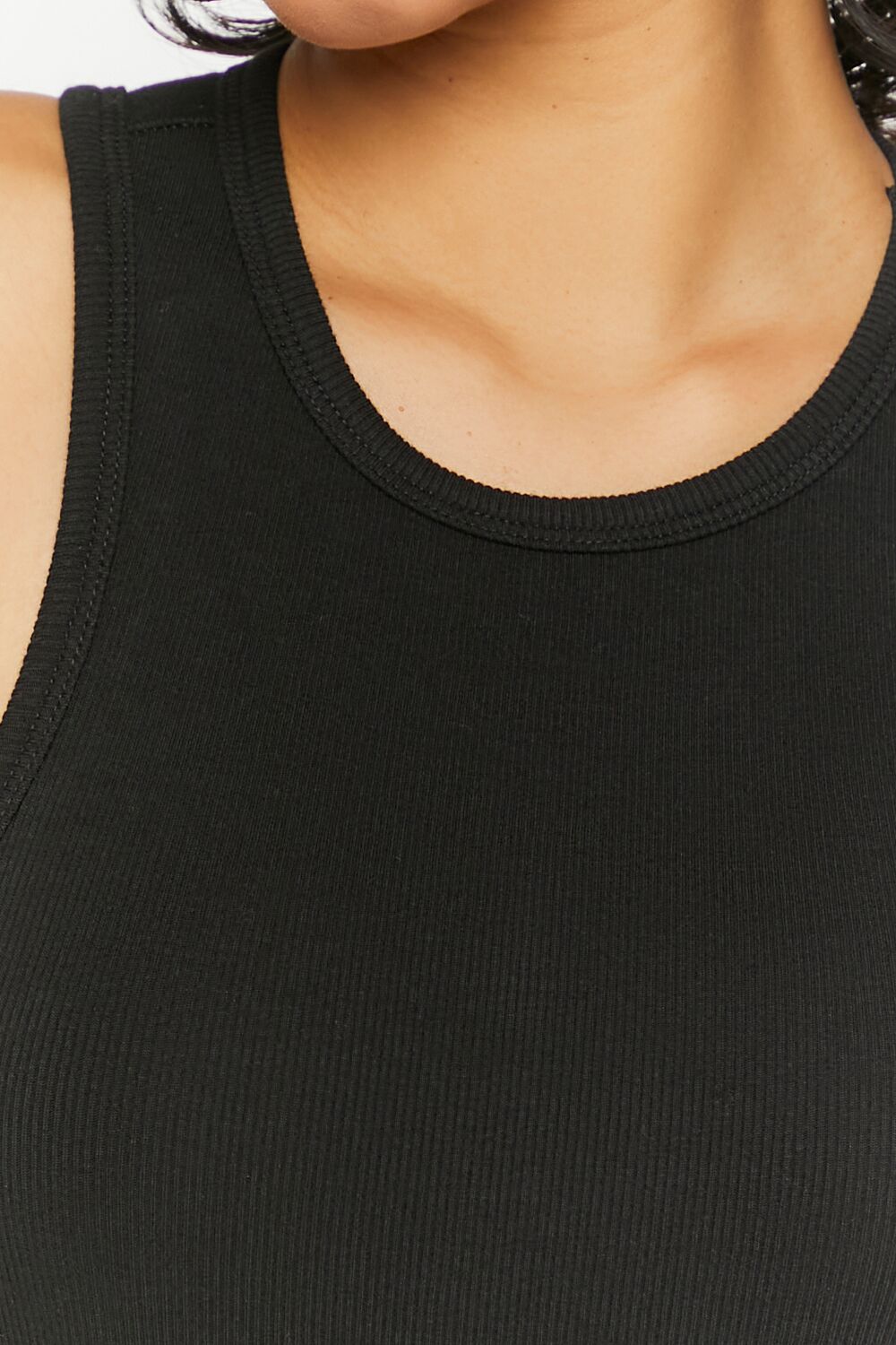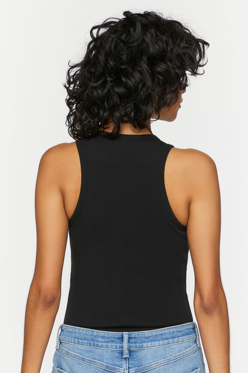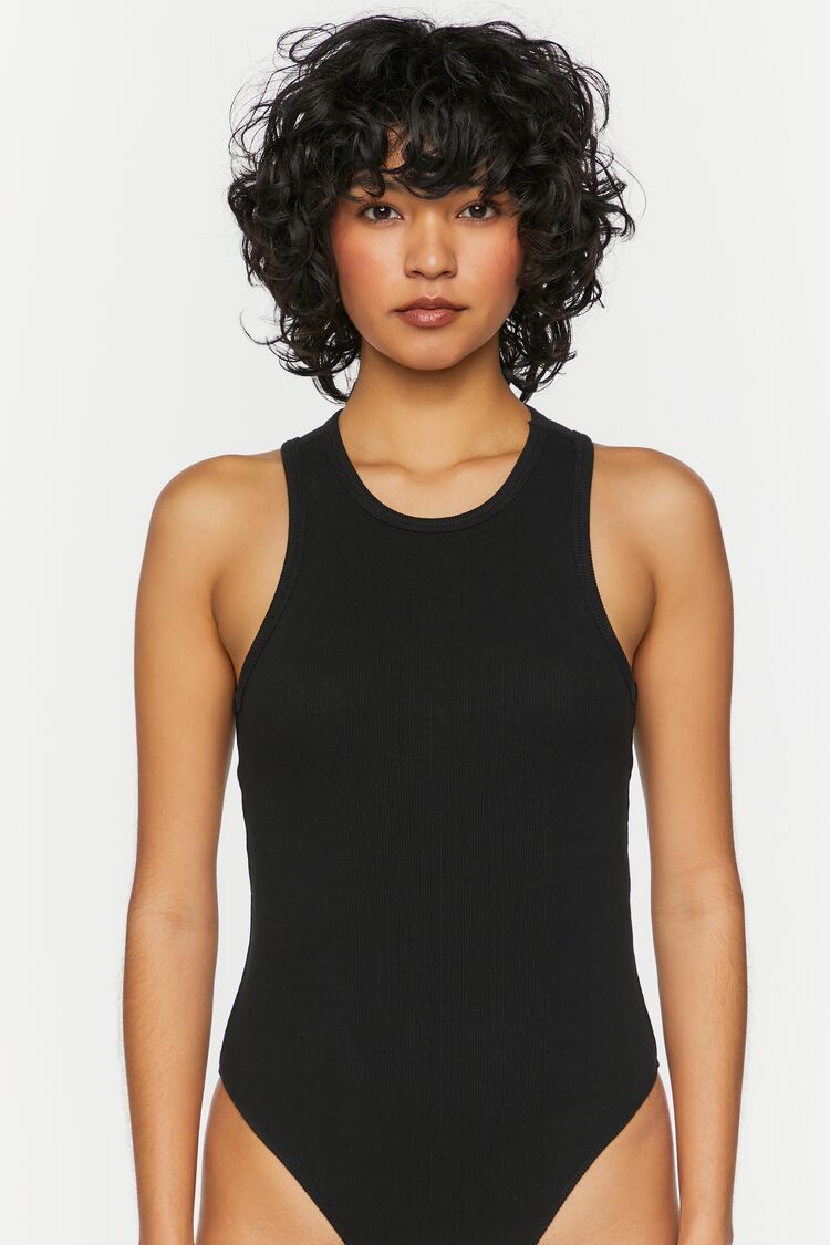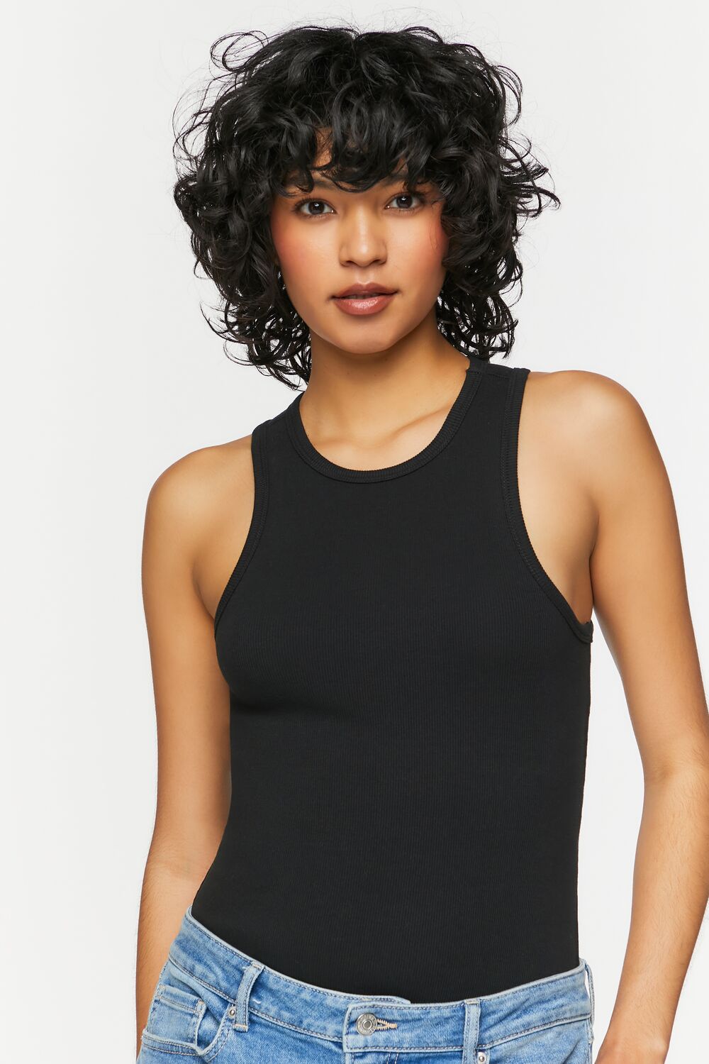 A ribbed knit bodysuit featuring a heathered construction. round neckline. sleeveless cut. and snap-button closures.