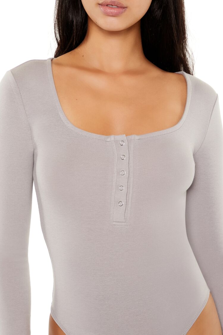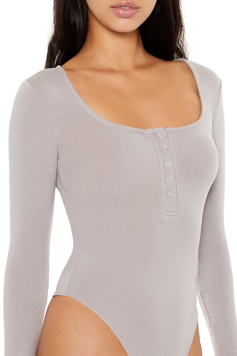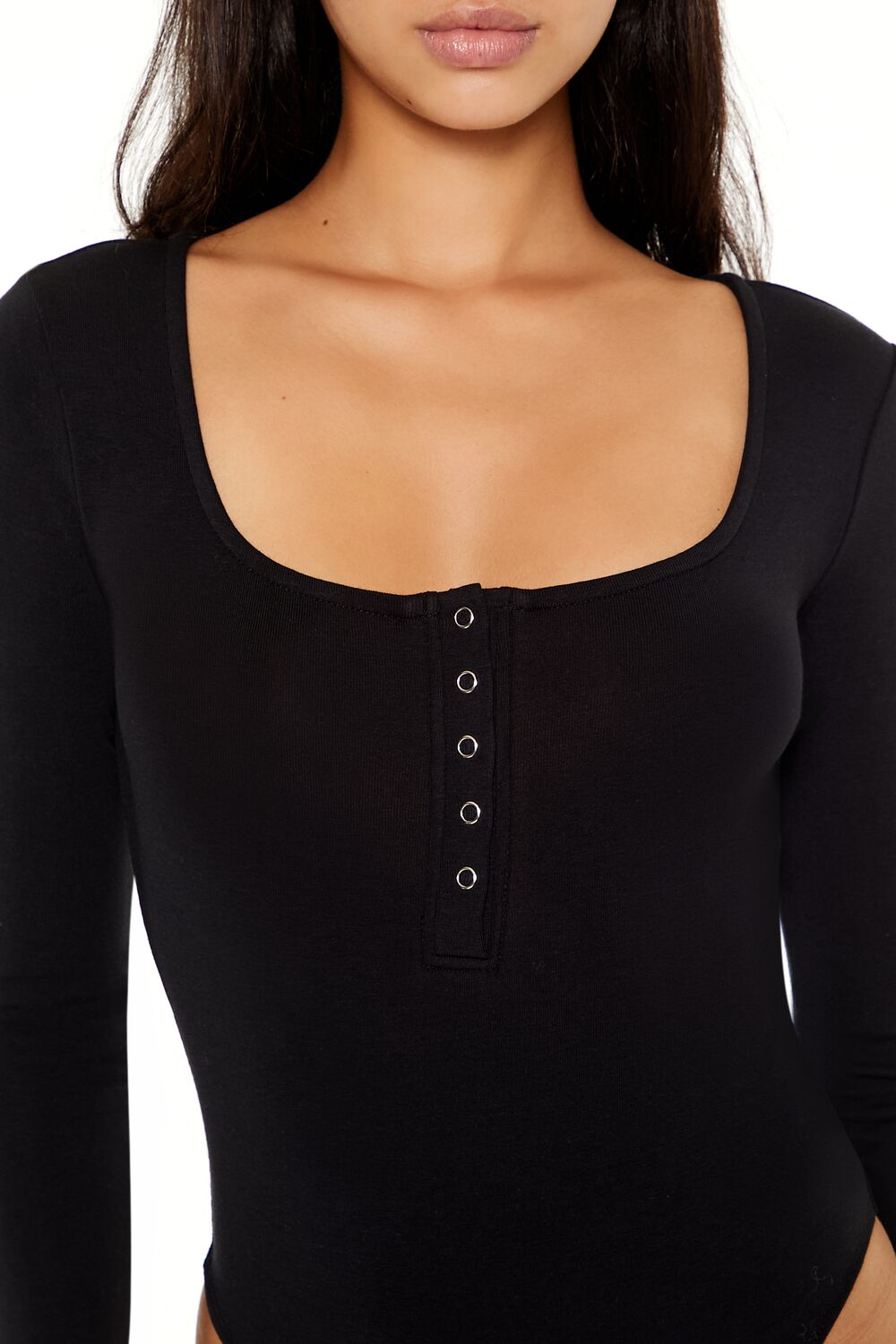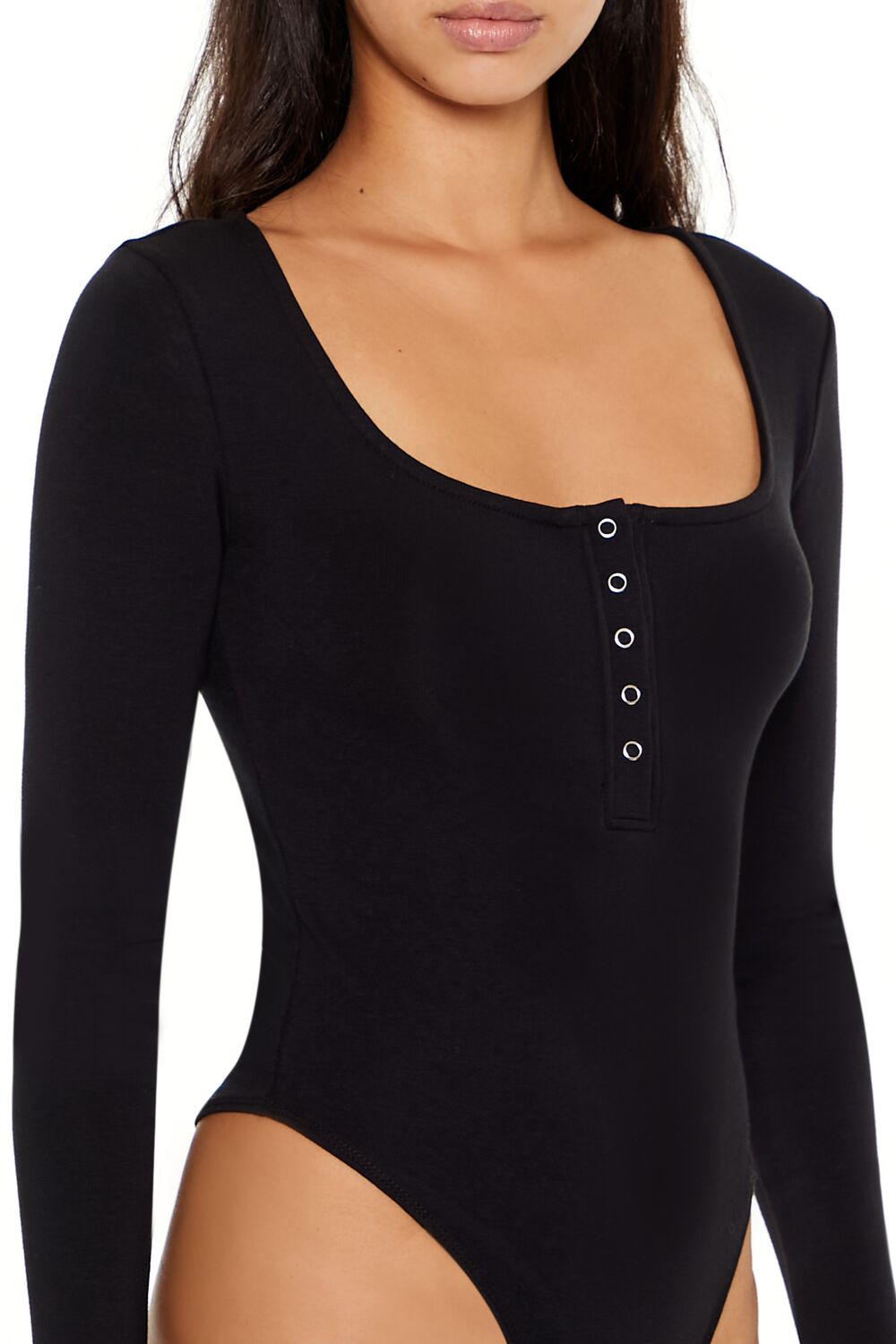 A knit Henley bodysuit featuring a square-cut neckline. long sleeves. partial button placket. and thong bottom cut.